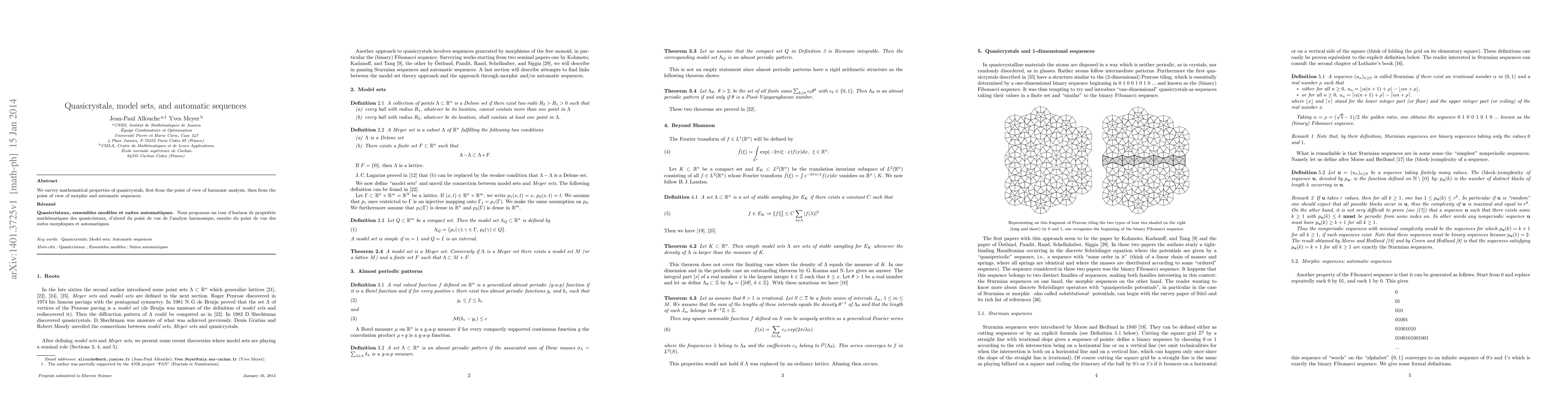 This paper surveys mathematical properties of quasicrystals through harmonic analysis and explores their connections to morphic and automatic sequences. It provides insights into the structure and behavior of quasicrystals from multiple mathematical perspectives.