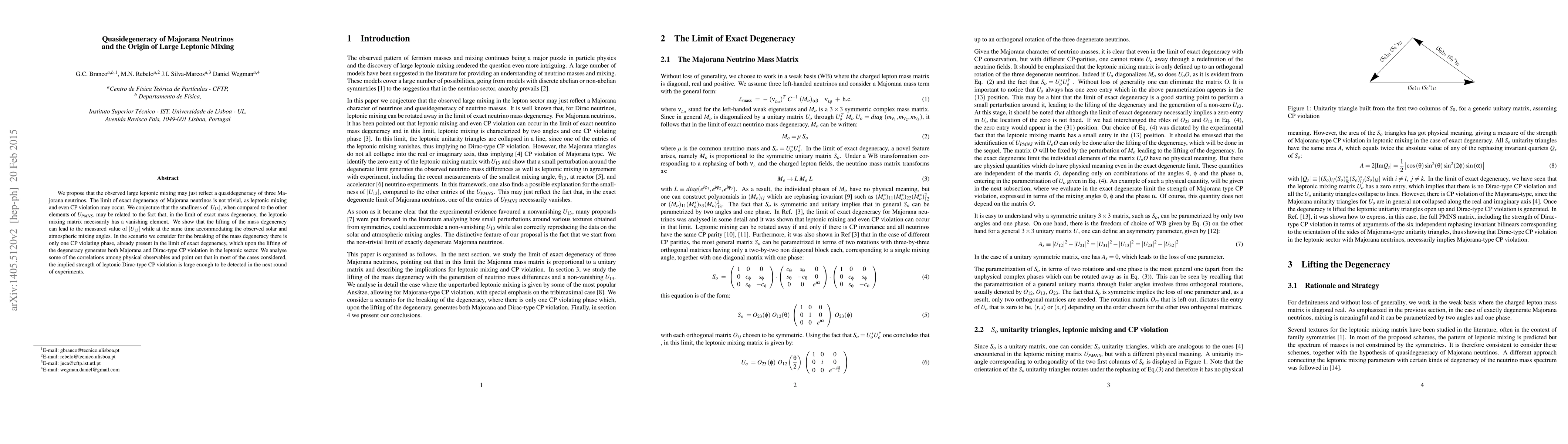 This paper proposes that large leptonic mixing arises from a quasidegeneracy of three Majorana neutrinos, suggesting that exact degeneracy leads to vanishing elements in the mixing matrix. The lifting of this degeneracy explains the observed smallness of $|U_{13}|$ and accommodates the solar and atmospheric mixing angles, while generating CP violation.