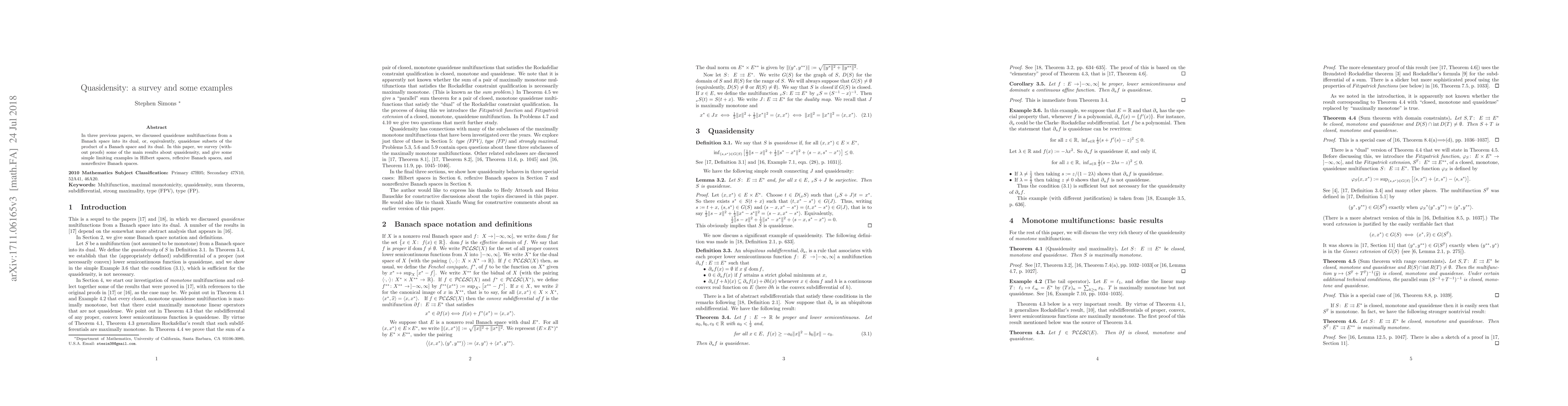 In three previous papers, we discussed quasidense multifunctions from a Banach space into its dual, or, equivalently, quasidense subsets of the product of a Banach space and its dual. In this paper, we survey (without proofs) some of the main results about quasidensity, and give some simple limiting examples in Hilbert spaces, reflexive Banach spaces, and nonreflexive Banach spaces.
