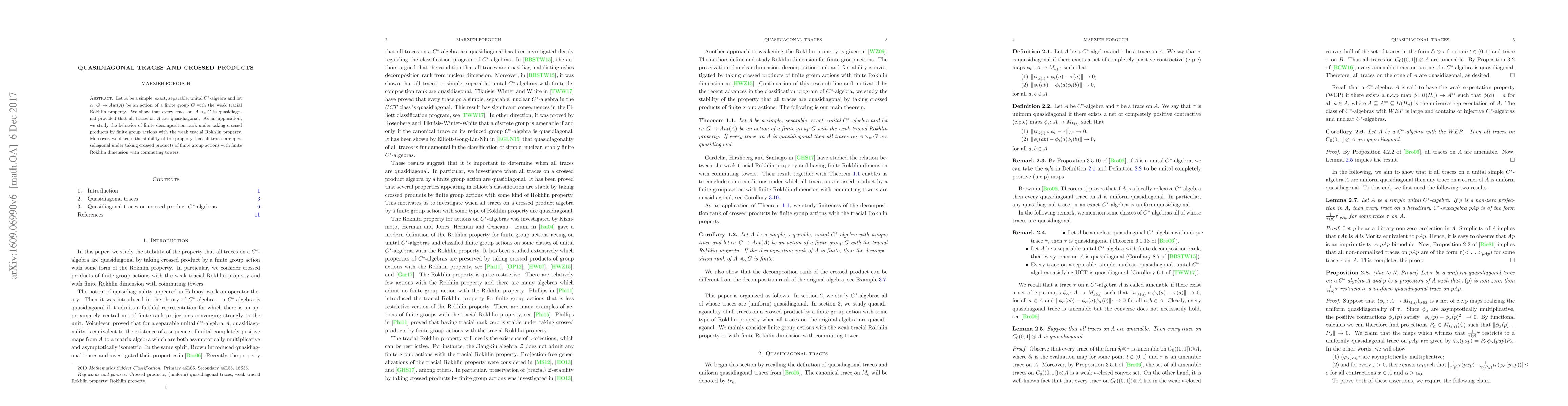 Researchers show that if every trace on a simple C*-algebra is quasidiagonal, then traces on the crossed product of that algebra with a finite group action are also quasidiagonal.