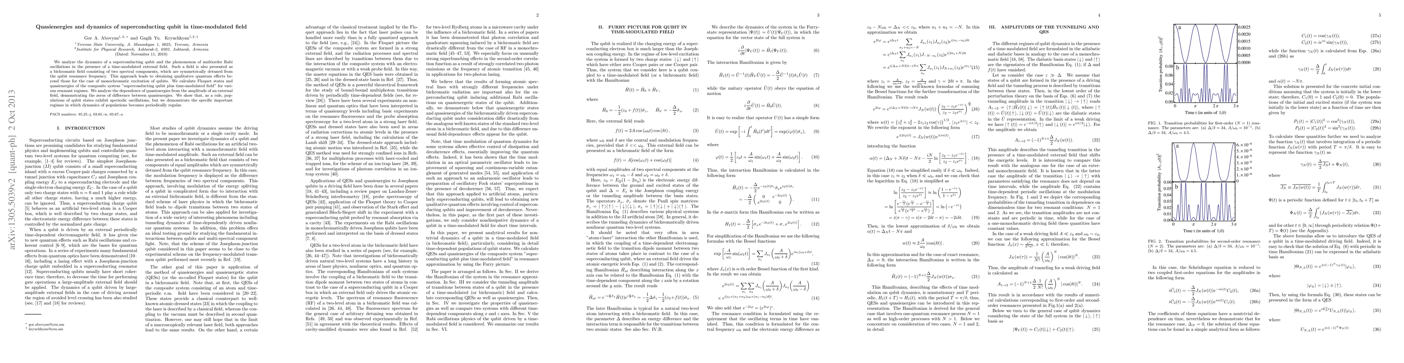 We analyze the dynamics of a superconducting qubit and the phenomenon of multiorder Rabi oscillations in the presence of a time-modulated external field. Such a field is also presented as a bichromatic field consisting of two spectral components, which are symmetrically detuned from the qubit resonance frequency. This approach leads to obtaining qualitative quantum effects beyond those for the case of monochromatic excitation of qubits. We calculate Floquet states and quasienergies of the composite system "superconducting qubit plus time-modulated field" for various resonant regimes. We analyze the dependence of quasienergies from the amplitude of an external field, demonstrating the zeros of difference between quasienergies. We show that, as a rule, populations of qubit states exhibit aperiodic oscillations, but we demonstrate the specific important regimes in which dynamics of populations becomes periodically regular.