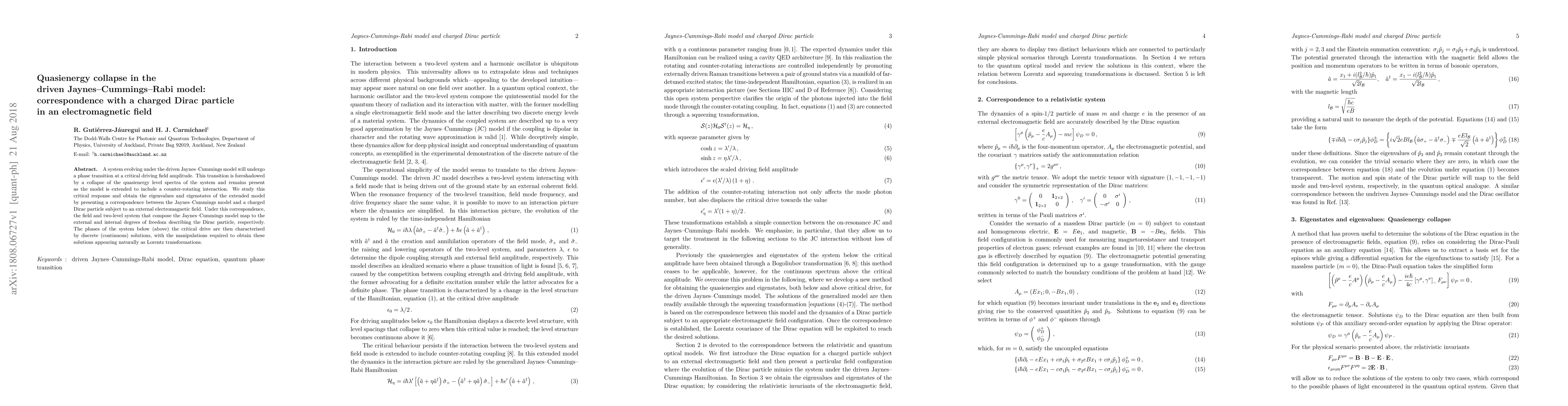 This paper investigates the quasienergy collapse in the driven Jaynes-Cummings-Rabi model, revealing a phase transition at a critical driving field. It establishes a correspondence between the model and a charged Dirac particle in an electromagnetic field, showing how the transition manifests as discrete or continuous solutions akin to Lorentz transformations.