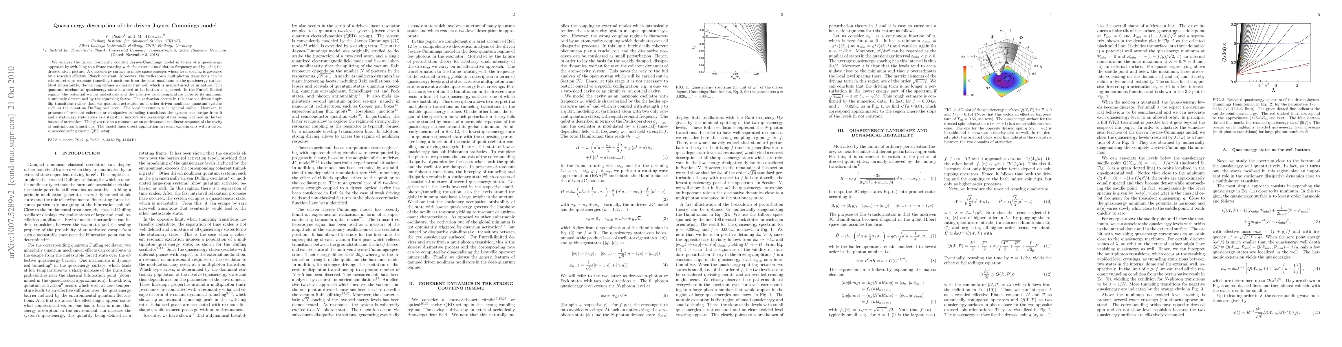 This paper explores the quasienergy approach for the driven Jaynes-Cummings model, revealing a quasienergy surface with level spacings governed by a rescaled Planck constant. The model's dynamics are characterized by resonant tunneling and a nonperturbative quasienergy well, leading to squeezed states and metastable potential wells in the Purcell regime.