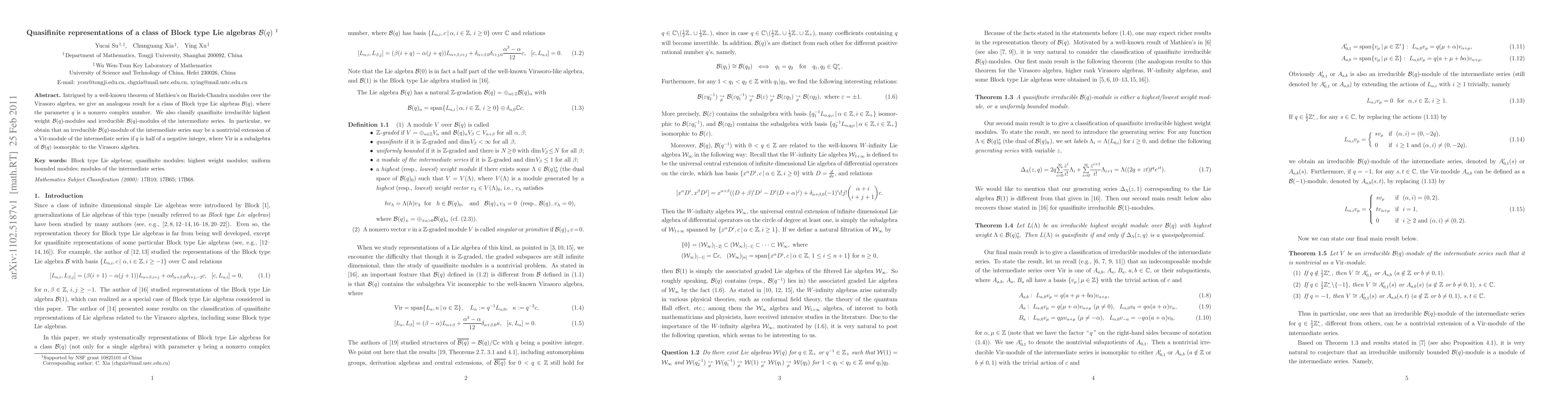 Intrigued by a well-known theorem of Mathieu's on Harish-Chandra modules over the Virasoro algebra, we give an analogous result for a class of Block type Lie algebras $\BB$, where the parameter $q$ is a nonzero complex number. We also classify quasifinite irreducible highest weight $\BB$-modules and irreducible $\BB$-modules of the intermediate series. In particular, we obtain that an irreducible $\BB$-module of the intermediate series may be a nontrivial extension of a $\Vir$-module of the intermediate series if $q$ is half of a negative integer, where $\Vir$ is a subalgebra of $\BB$ isomorphic to the Virasoro algebra.