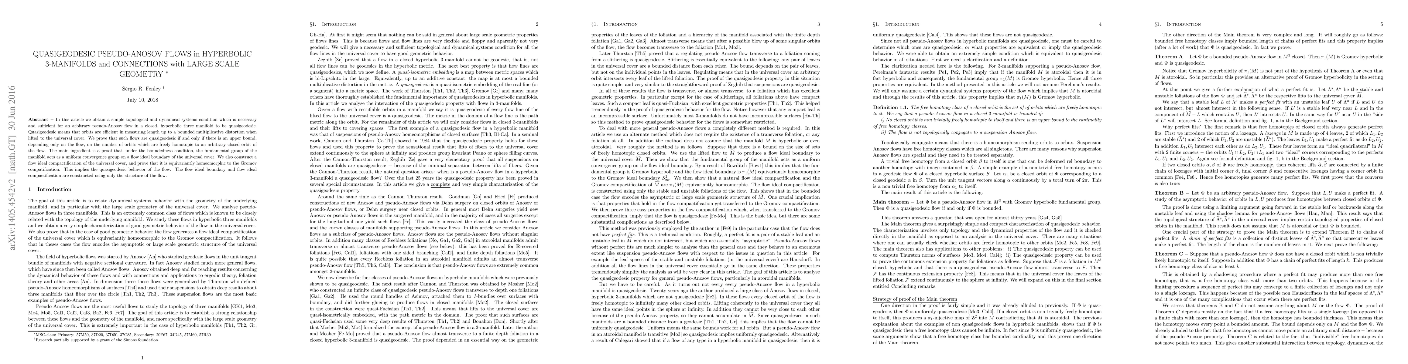 In this article we obtain a simple topological and dynamical systems condition which is necessary and sufficient for an arbitrary pseudo-Anosov flow in a closed, hyperbolic three manifold to be quasigeodesic. Quasigeodesic means that orbits are efficient in measuring length up to a bounded multiplicative distortion when lifted to the universal cover. We prove that such flows are quasigeodesic if and only if there is an upper bound, depending only on the flow, to the number of orbits which are freely homotopic to an arbitrary closed orbit of the flow. The main ingredient is a proof that under the boundedness condition, the fundamental group of the manifold acts as a uniform convergence group on a flow ideal boundary of the universal cover. We also construct a flow ideal compactification of the universal cover and prove it is equivariantly homeomorphic to the Gromov compatification. This implies the quasigeodesic behavior of the flow. The flow ideal boundary and flow ideal compactification are constructed using only the structure of the flow.