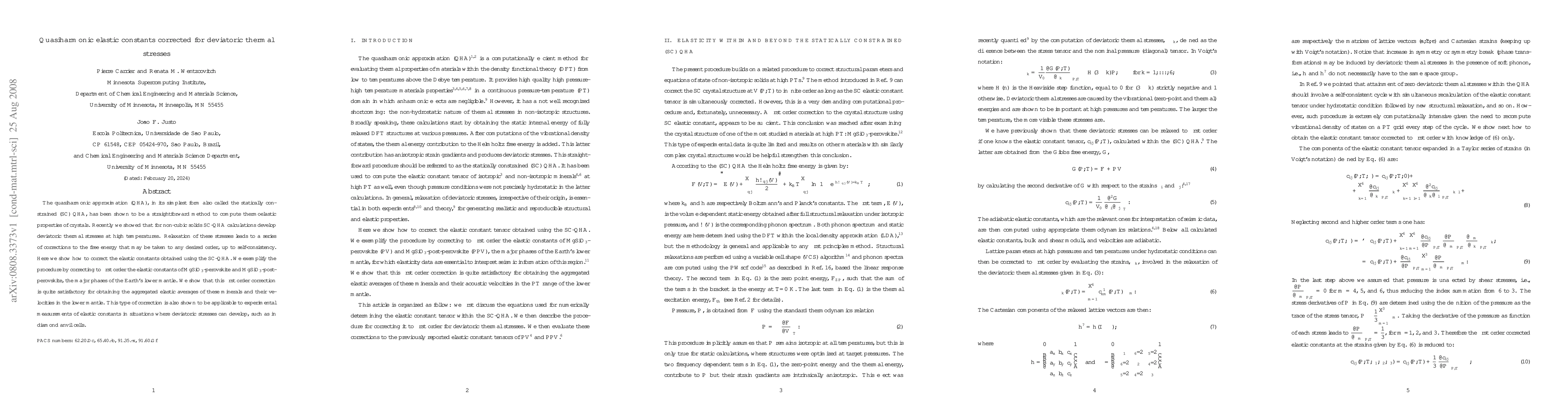 The quasiharmonic approximation (QHA), in its simplest form also called the statically constrained (SC) QHA, has been shown to be a straightforward method to compute thermoelastic properties of crystals. Recently we showed that for non-cubic solids SC-QHA calculations develop deviatoric thermal stresses at high temperatures. Relaxation of these stresses leads to a series of corrections to the free energy that may be taken to any desired order, up to self-consistency. Here we show how to correct the elastic constants obtained using the SC-QHA. We exemplify the procedure by correcting to first order the elastic constants of MgSiO$_3$-perovskite and MgSiO$_3$-post-perovskite, the major phases of the Earth's lower mantle. We show that this first order correction is quite satisfactory for obtaining the aggregated elastic averages of these minerals and their velocities in the lower mantle. This type of correction is also shown to be applicable to experimental measurements of elastic constants in situations where deviatoric stresses can develop, such as in diamond anvil cells.