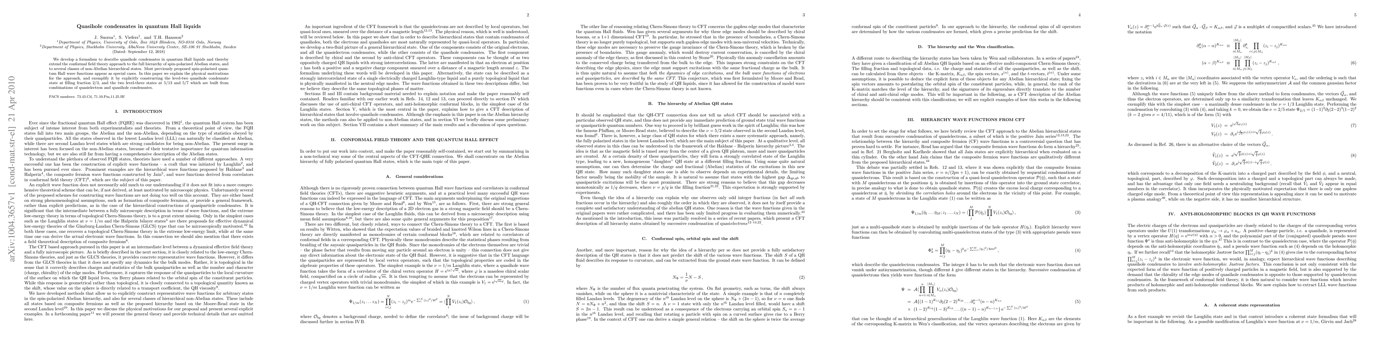 We develop a formalism to describe quasihole condensates in quantum Hall liquids and thereby extend the conformal field theory approach to the full hierarchy of spin-polarized Abelian states, and to several classes of non-Abelian hierarchical states. Most previously proposed spin-polarized quantum Hall wave functions appear as special cases. In this paper we explain the physical motivations for the approach, and exemplify it by explicitly constructing the level-two quasihole condensate state at filling fraction 2/3, and the two level-three states at 5/13 and 5/7 which are built from combinations of quasielectron and quasihole condensates.