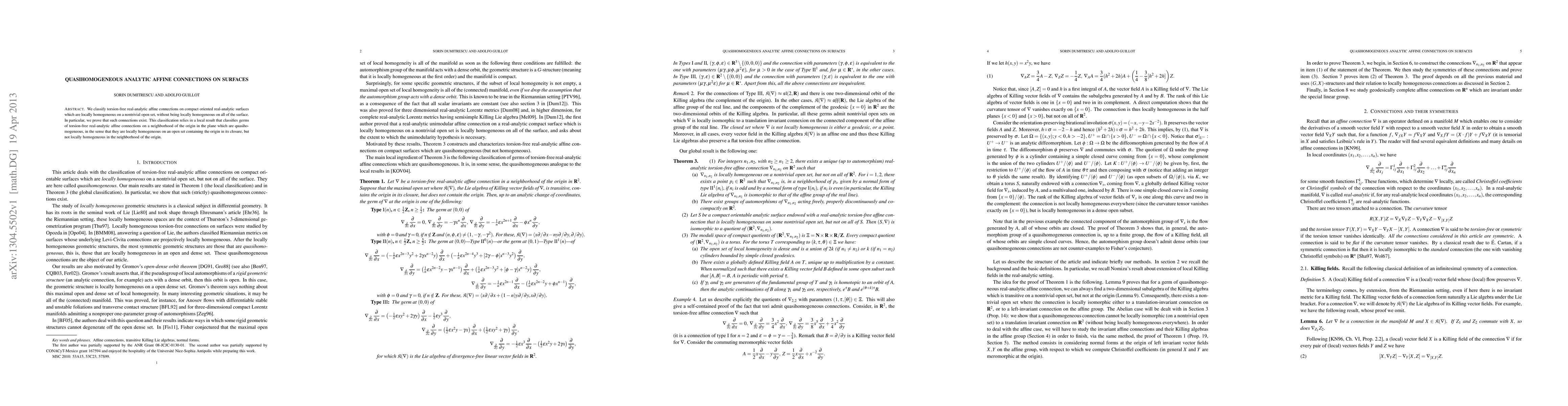 This paper classifies torsion-free real-analytic affine connections on compact oriented surfaces that are locally homogeneous on a nontrivial open set but not everywhere. It proves the existence of such connections and relies on a local classification of quasihomogeneous connections in the plane.