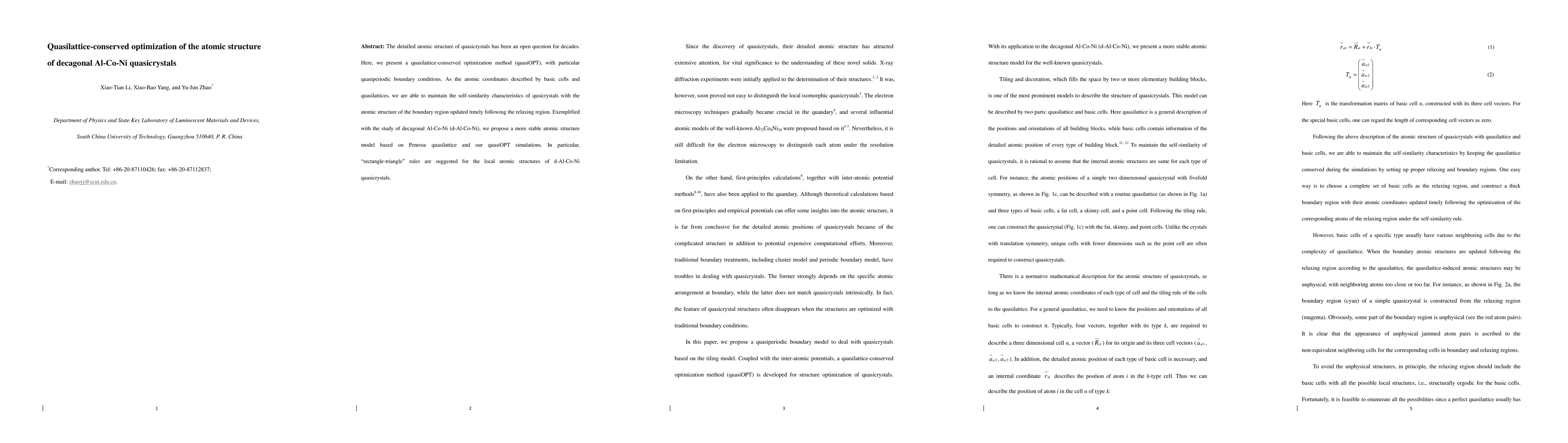 This paper introduces a quasilattice-conserved optimization method (quasiOPT) to refine the atomic structure of decagonal Al-Co-Ni quasicrystals, proposing a more stable model based on Penrose quasilattice and "rectangle-triangle" rules for local atomic arrangements.