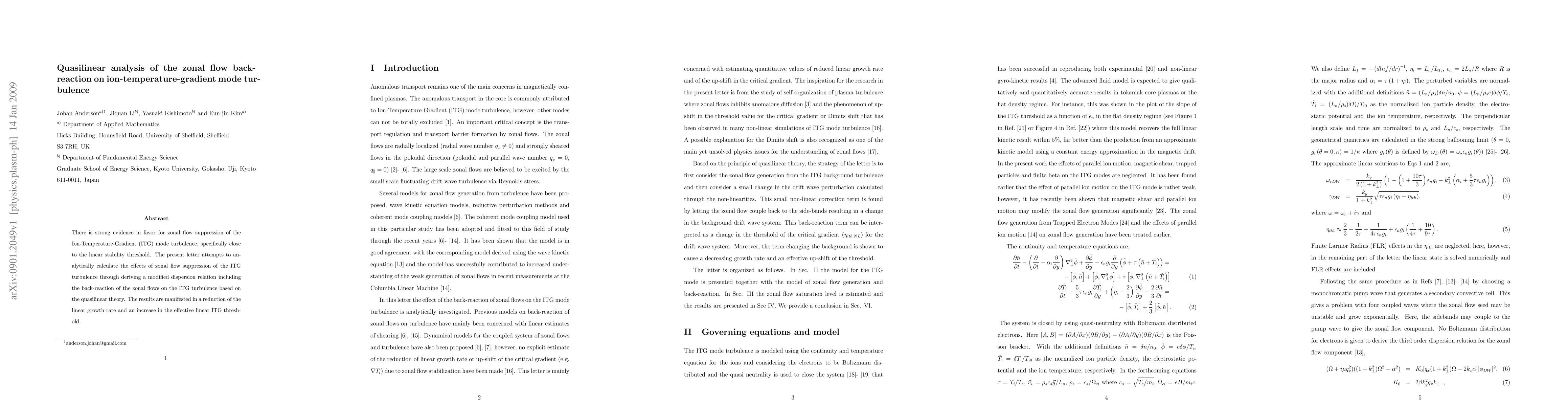 This paper analytically investigates the suppression of Ion-Temperature-Gradient (ITG) mode turbulence by zonal flows using quasilinear theory, deriving a modified dispersion relation that shows a reduction in the linear growth rate and an elevated effective ITG threshold. The findings highlight the significant impact of zonal flow back-reaction on ITG turbulence near the linear stability threshold.