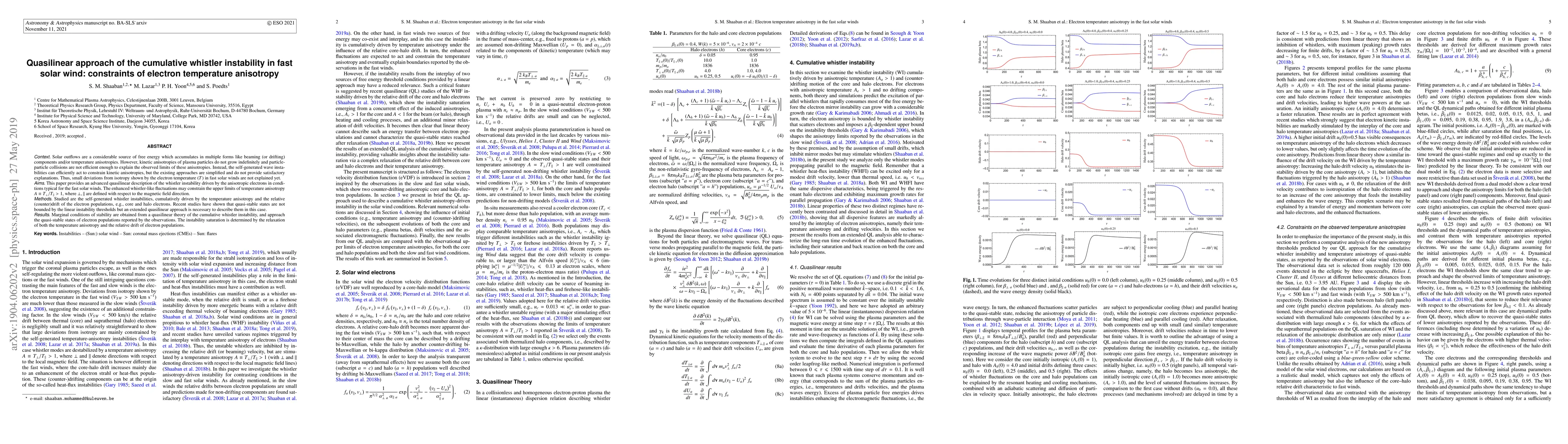 This paper develops a quasilinear approach to describe the cumulative whistler instability in fast solar winds, focusing on how it constrains electron temperature anisotropy. The study finds that the instability saturation results from the relaxation of both temperature anisotropy and the relative drift of electron populations, providing a better explanation for observed limits of these anisotropies.