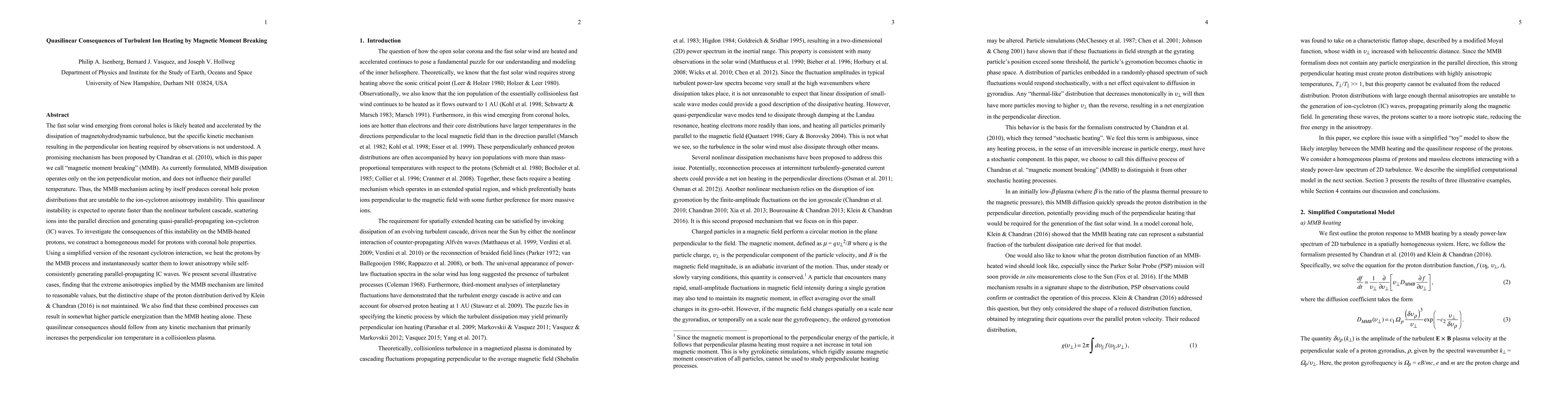 This paper explores the 'magnetic moment breaking' (MMB) mechanism for turbulent ion heating in the solar wind. Using a homogeneous model of coronal hole protons, the authors find that while MMB heating alone creates extreme anisotropies, these are limited when considering the quasilinear instability triggered. This instability leads to ion scattering into the parallel direction, generating ion-cyclotron waves. The combined processes can enhance particle energization beyond MMB heating alone, suggesting broader implications for kinetic heating mechanisms in collisionless plasmas.
