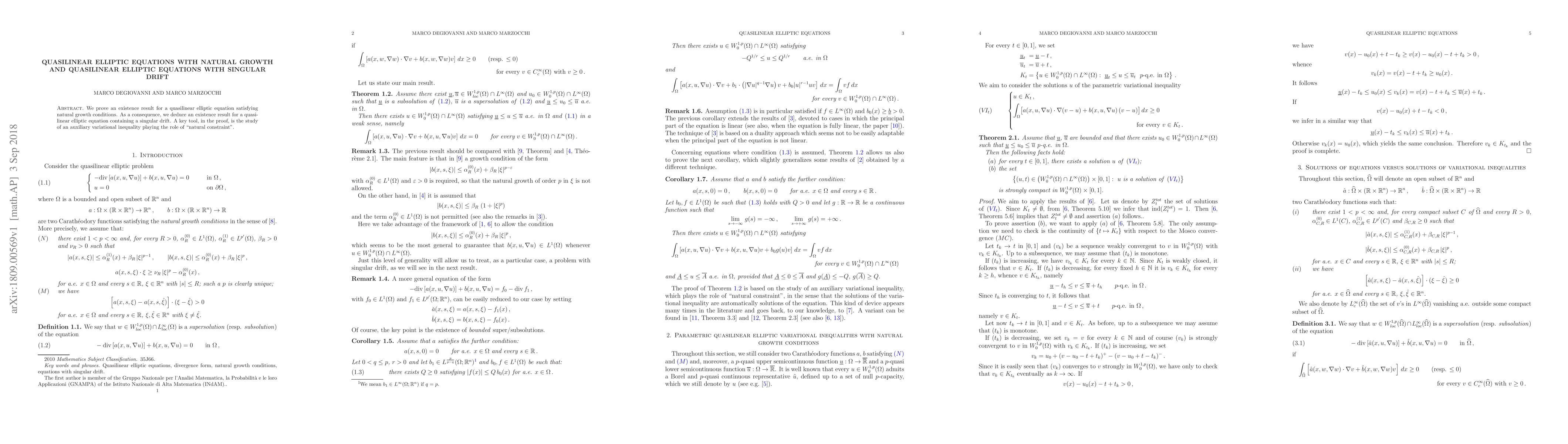 Summary: This paper establishes the existence of solutions for quasilinear elliptic equations under natural growth conditions and for those with singular drift terms, utilizing an auxiliary variational inequality as a crucial analytical tool.