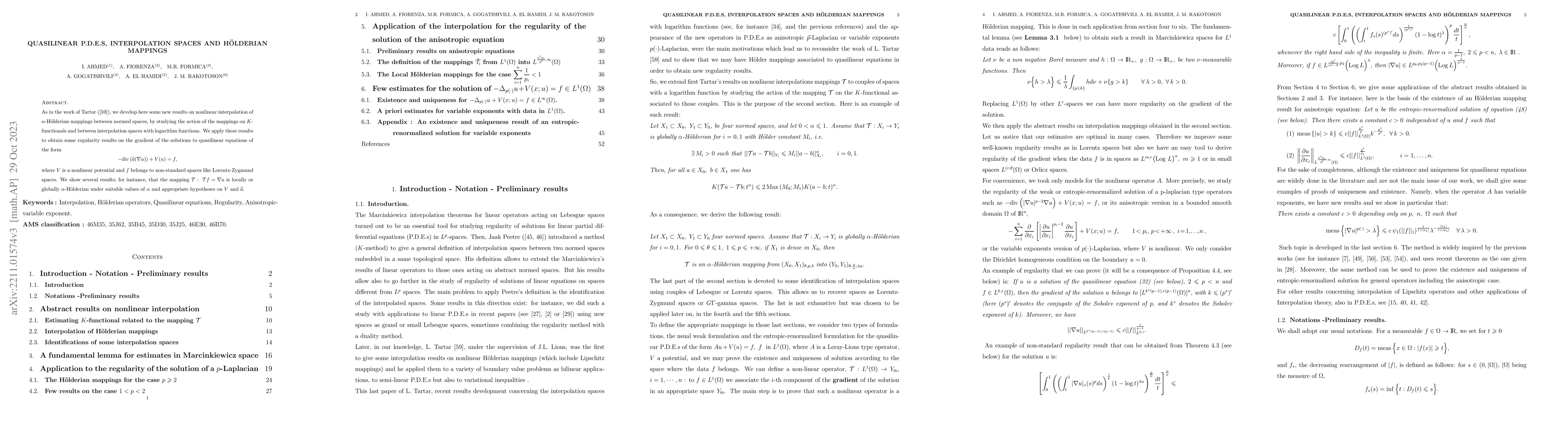 This paper develops new results on nonlinear interpolation of $\alpha$-Hölderian mappings between normed spaces, applying these to quasilinear partial differential equations. It shows that the gradient of solutions to such equations is $\alpha$-Hölderian under specific conditions on the potential and coefficients.