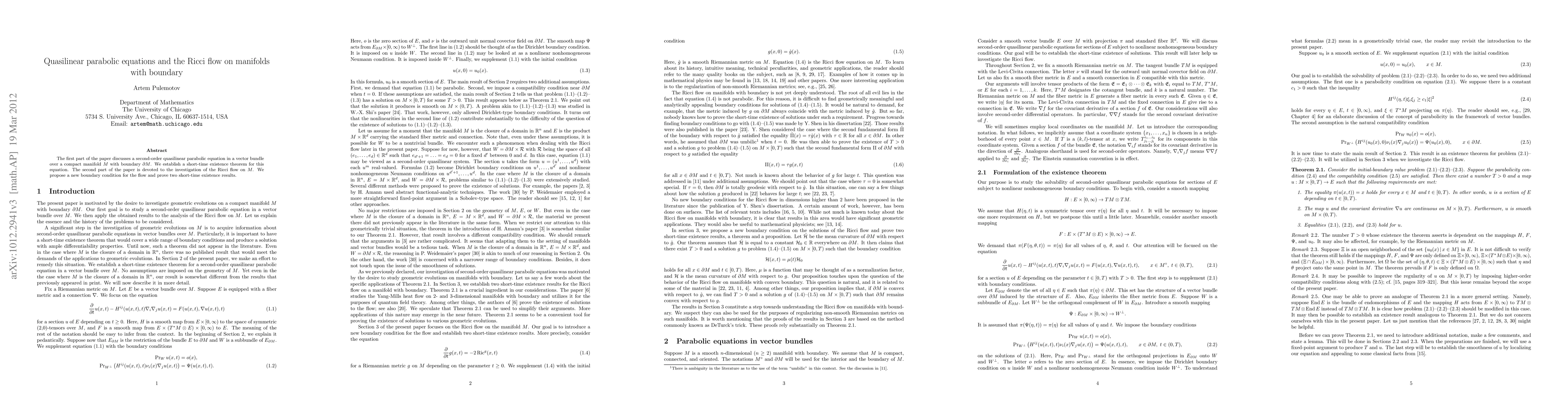 The first part of the paper discusses a second-order quasilinear parabolic equation in a vector bundle over a compact manifold $M$ with boundary $\partial M$. We establish a short-time existence theorem for this equation. The second part of the paper is devoted to the investigation of the Ricci flow on $M$. We propose a new boundary condition for the flow and prove two short-time existence results.