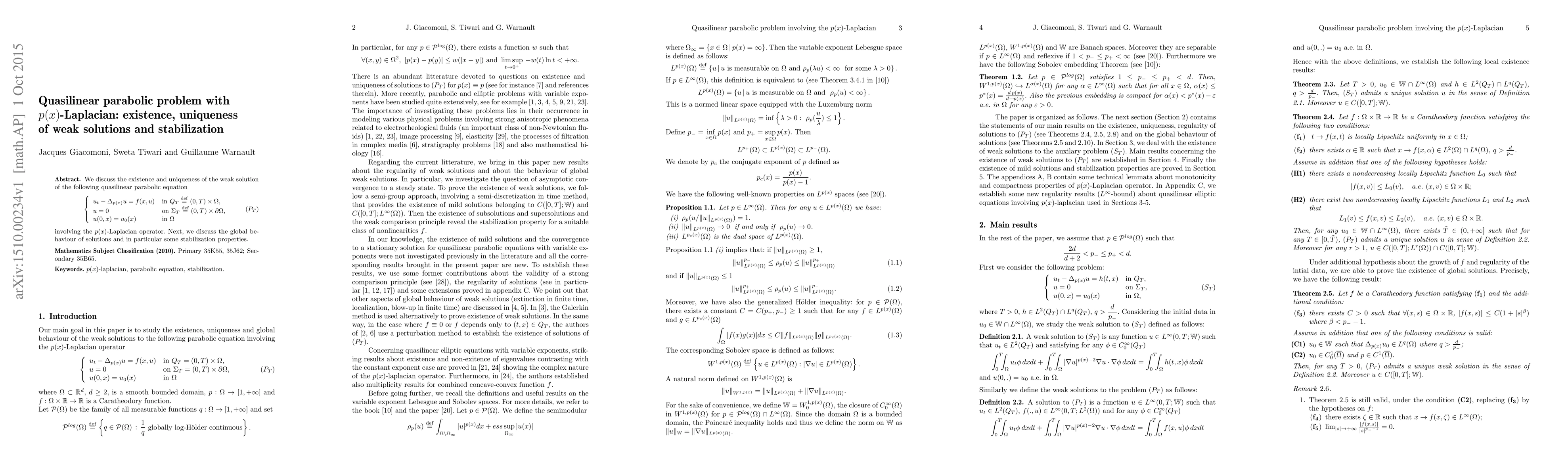 This paper investigates the existence and uniqueness of weak solutions for a quasilinear parabolic equation with a $p(x)$-Laplacian operator, and examines the stabilization properties and global behavior of these solutions.