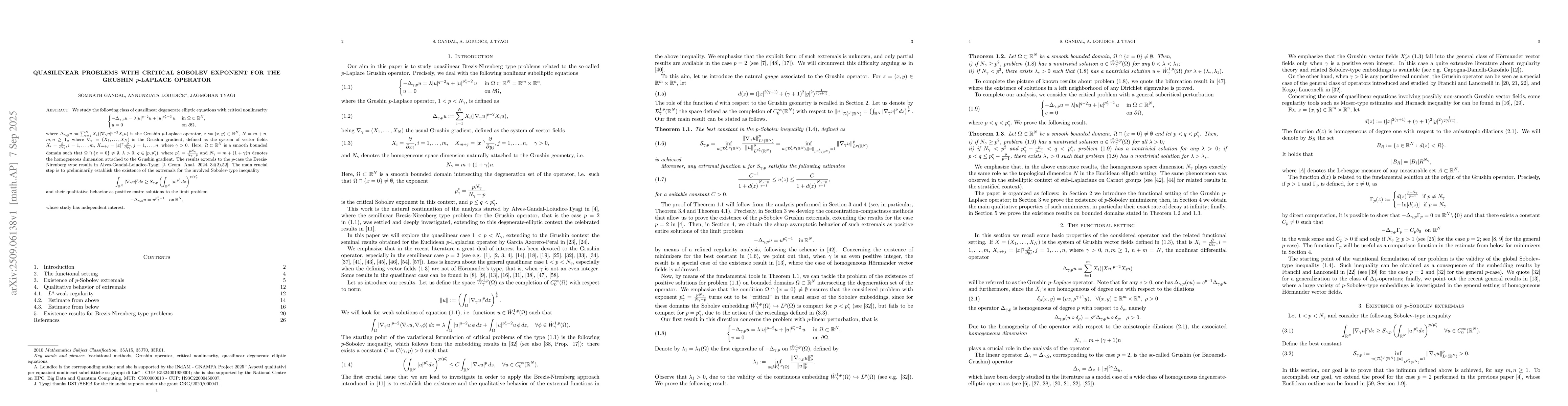We study the following class of quasilinear degenerate elliptic equations with critical nonlinearity \begin{align*} \begin{cases}-\Delta_{\gamma,p} u= \lambda |u|^{q-2}u+|u|^{p_{\gamma}^{*}-2}u & \text{ in } \Omega\subset \mathbb{R}^N, \\ u=0 & \text{ on } \partial \Omega, \end{cases} \end{align*} where $\Delta_{\gamma, p}v:=\sum_{i=1}^N X_i(|\nabla_\gamma u|^{p-2}X_i u)$ is the Grushin $p$-Laplace operator, $z:=(x, y) \in \mathbb{R}^N$, $N=m+n,$ $m,n \geq 1,$, where $\nabla_\gamma=(X_1, \ldots, X_N)$ is the Grushin gradient, defined as the system of vector fields $X_i=\frac{\partial}{\partial x_i}, i=1, \ldots, m$, $X_{m+j}=|x|^\gamma \frac{\partial}{\partial y_j}, j=1, \ldots, n$, where $\gamma>0$. Here, $\Omega \subset \mathbb{R}^{N}$ is a smooth bounded domain such that $\Omega\cap \{x=0\}\neq \emptyset$, $\lambda>0$, $q \in [p,p_\gamma^*)$, where $p_{\gamma}^{*}=\frac{pN_\gamma}{N_\gamma-p}$ and $N_\gamma=m+(1+\gamma)n$ denotes the homogeneous dimension attached to the Grushin gradient. The results extends to the $p$-case the Brezis-Nirenberg type results in Alves-Gandal-Loiudice-Tyagi [J. Geom. Anal. 2024, 34(2),52]. The main crucial step is to preliminarily establish the existence of the extremals for the involved Sobolev-type inequality \begin{equation*} \int_{\mathbb{R}^N} |\nabla_{\gamma} u|^p dz \geq S_{\gamma,p} \left ( \int_{\mathbb{R}^N} |u|^{p_\gamma^*} dz \right )^{p/p_\gamma^*} \end{equation*} and their qualitative behavior as positive entire solutions to the limit problem \begin{equation*} -\Delta_{\gamma,p} u= u^{p_{\gamma}^{*}-1}\quad \mbox{on}\, \mathbb{R}^N, \end{equation*} whose study has independent interest.