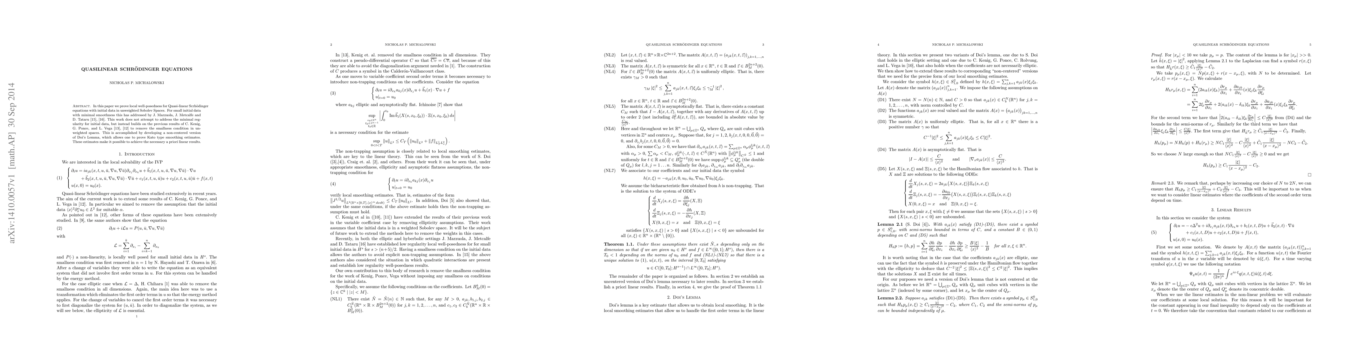 In this paper we prove local well-posedness for Quasi-linear Scrh\"odinger equations with initial data in unweighted Sobolev Spaces. For small initial data with minimal smoothness this has addressed by J. Marzuola, J. Metcalfe and D. Tataru. This work does not attempt to address the minimal regularity for initial data, but instead builds on the previous results of C. Kenig, G. Ponce, and L. Vega to remove the smallness condition in unweighted spaces. This is accomplished by developing a uncentered version of Doi's Lemma, which allows one to prove Kato type smoothing estimates. These estimates make it possible to achieve the necessary a priori linear results.