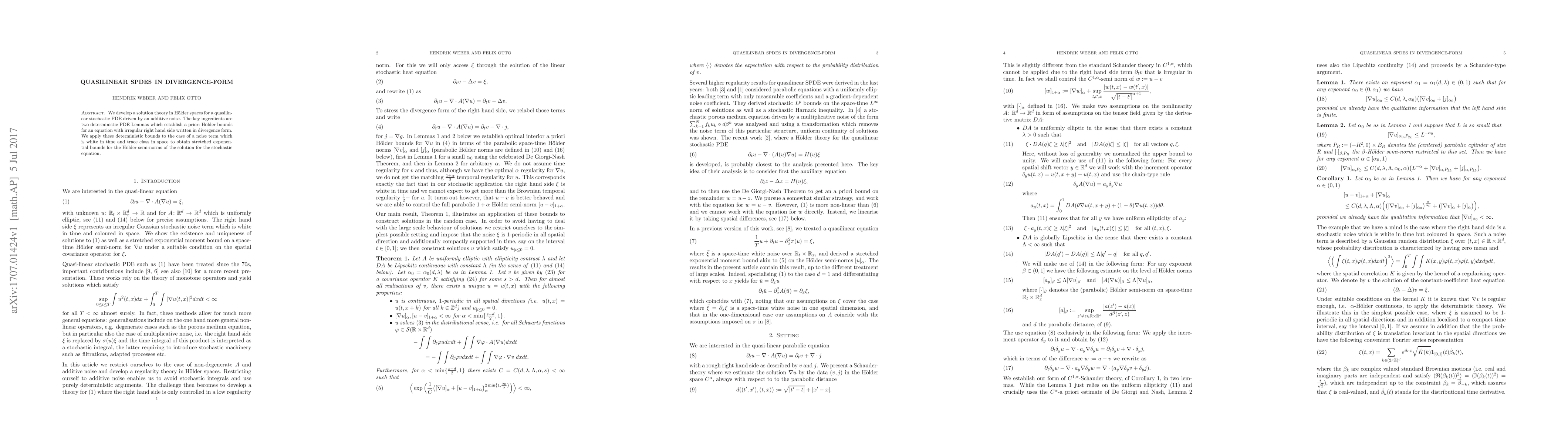 We develop a solution theory in H\"older spaces for a quasilinear stochastic PDE driven by an additive noise. The key ingredients are two deterministic PDE Lemmas which establish a priori H\"older bounds for an equation with irregular right hand side written in divergence form. We apply these deterministic bounds to the case of a noise term which is white in time and trace class in space to obtain stretched exponential bounds for the H\"older semi-norms of the solution for the stochastic equation.
