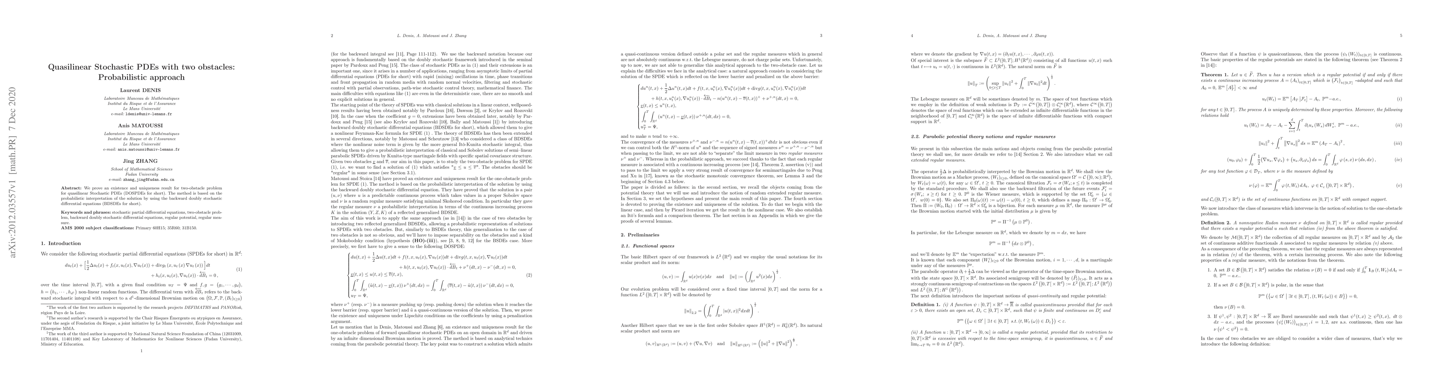 Summary: This paper establishes existence and uniqueness for quasilinear stochastic PDEs with two obstacles, utilizing a probabilistic approach through backward doubly stochastic differential equations (BDSDEs). The method provides a robust framework for solving the two-obstacle problem.