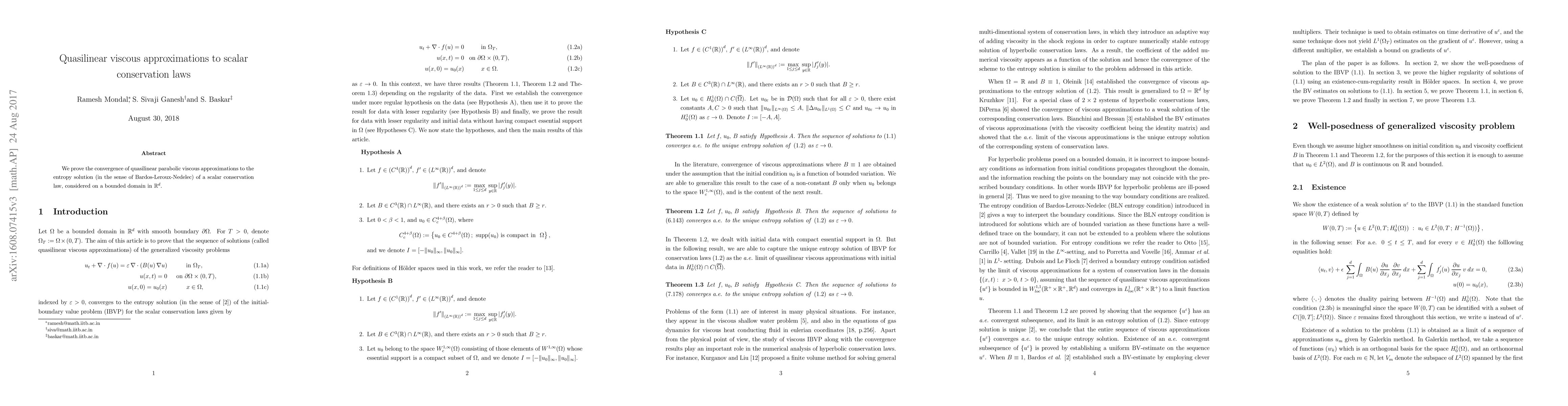 We prove the convergence of quasilinear parabolic viscous approximations to the entropy solution (in the sense of Bardos-Leroux-Nedelec) of a scalar conservation law, considered on a bounded domain in $\R^d$.