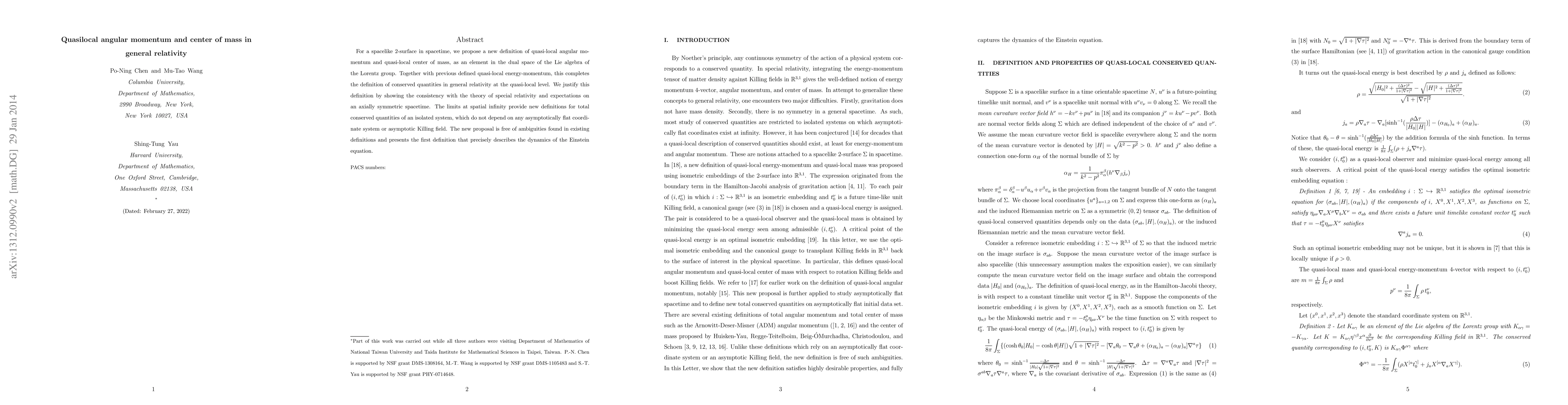The paper introduces a novel definition of quasi-local angular momentum and center of mass in general relativity, completing the set of quasi-local conserved quantities and providing a consistent framework for describing the dynamics of gravitational systems.