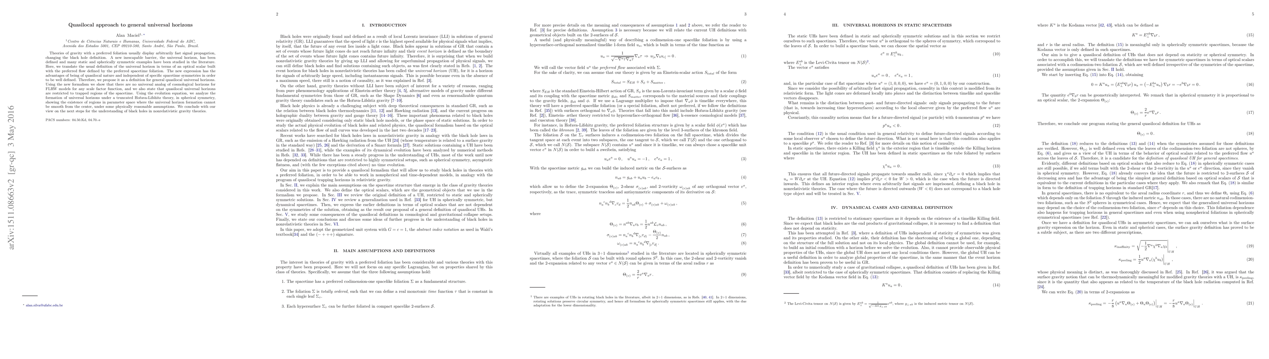 Theories of gravity with a preferred foliation usually display arbitrarily fast signal propagation, changing the black hole definition. A new inescapable barrier, the universal horizon, has been defined and many static and spherically symmetric examples have been studied in the literature. Here, we translate the usual definition of the universal horizon in terms of an optical scalar built with the preferred flow defined by the preferred spacetime foliation. The new expression has the advantages of being of quasilocal nature and independent of specific spacetime symmetries in order to be well defined. Therefore, we propose it as a definition for general quasilocal universal horizons. Using the new formalism we show that there are no universal analog of cosmological horizons for FLRW models for any scale factor function, and we also state that quasilocal universal horizons are restricted to trapped regions of the spacetime. Using the evolution equation, we analyze the formation of universal horizons under a truncated Horava-Lifshitz theory, in spherical symmetry, showing the existence of regions in parameter space where the universal horizon formation cannot be smooth from the center, under some physically reasonable assumptions. We conclude with our view on the next steps for the understanding of black holes in nonrelativistic gravity theories.