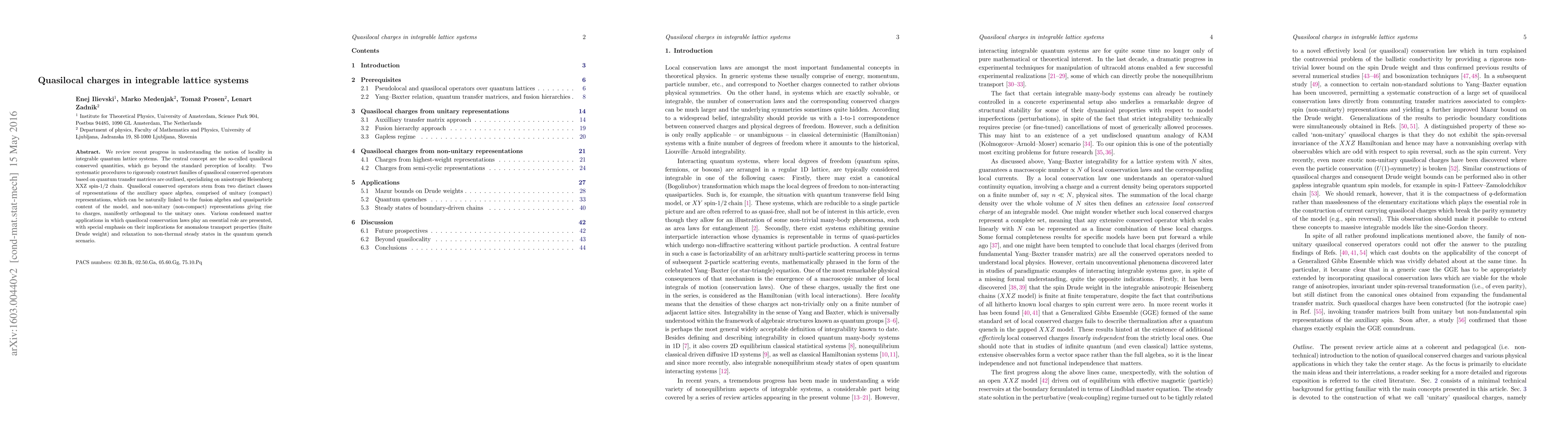 We review recent progress in understanding the notion of locality in integrable quantum lattice systems. The central concept are the so-called quasilocal conserved quantities, which go beyond the standard perception of locality. Two systematic procedures to rigorously construct families of quasilocal conserved operators based on quantum transfer matrices are outlined, specializing on anisotropic Heisenberg XXZ spin-1/2 chain. Quasilocal conserved operators stem from two distinct classes of representations of the auxiliary space algebra, comprised of unitary (compact) representations, which can be naturally linked to the fusion algebra and quasiparticle content of the model, and non-unitary (non-compact) representations giving rise to charges, manifestly orthogonal to the unitary ones. Various condensed matter applications in which quasilocal conservation laws play an essential role are presented, with special emphasis on their implications for anomalous transport properties (finite Drude weight) and relaxation to non-thermal steady states in the quantum quench scenario.