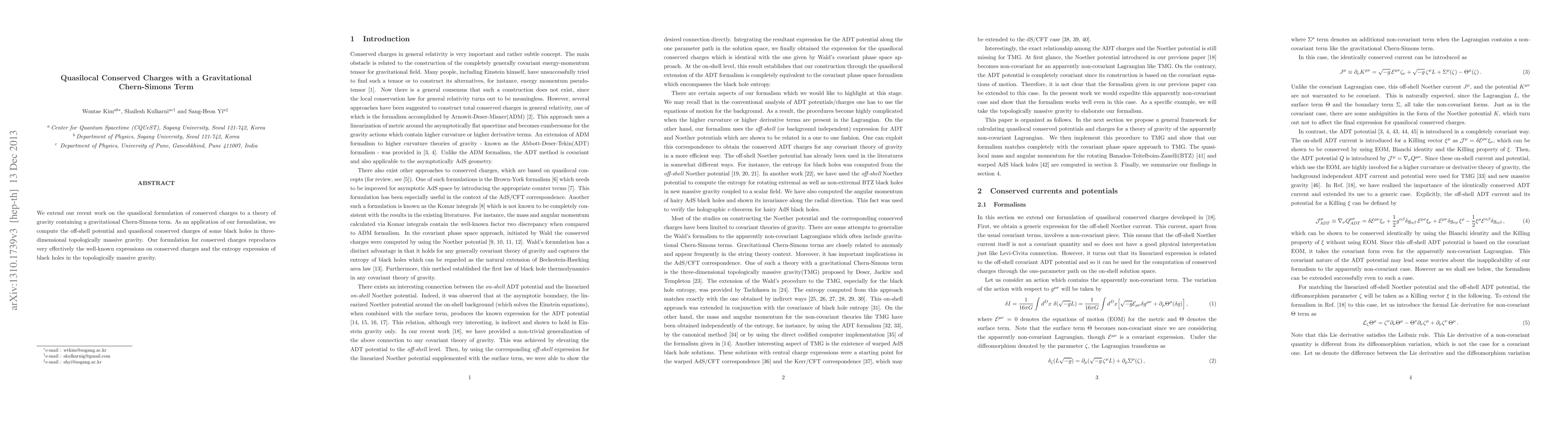 This paper extends quasilocal conserved charge formulations to include a gravitational Chern-Simons term, and applies this to compute the off-shell potential and quasilocal charges for black holes in three-dimensional topologically massive gravity, successfully reproducing known results for these charges and black hole entropy.
