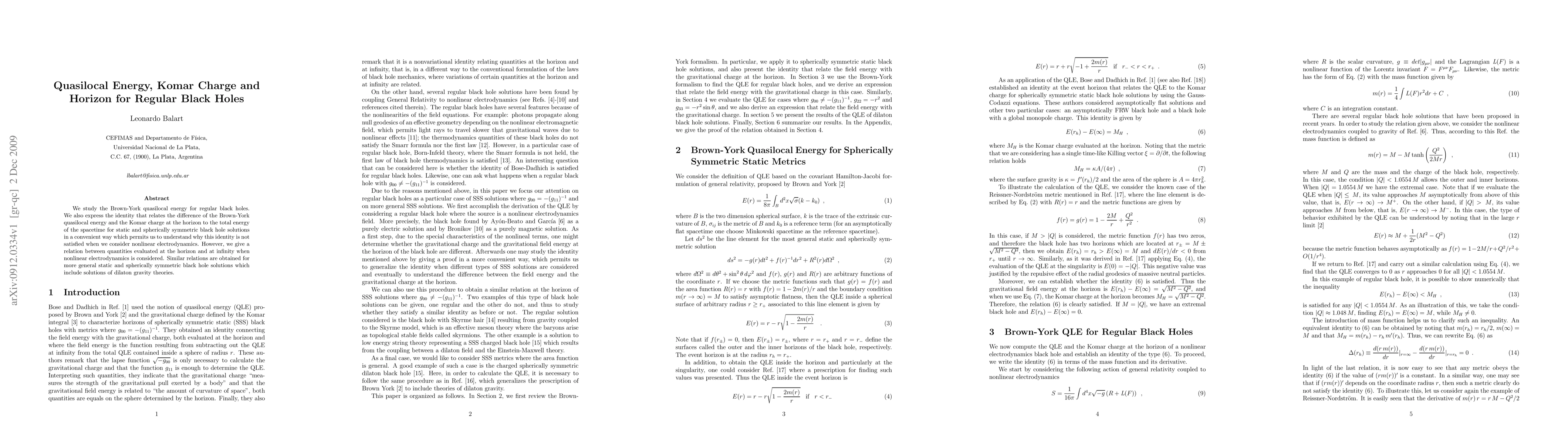This paper investigates the Brown-York quasilocal energy and Komar charge for regular black holes, revealing an identity linking these quantities to the total spacetime energy. It also addresses the failure of this identity in nonlinear electrodynamics, providing a new relation between horizon and infinity values in such scenarios.