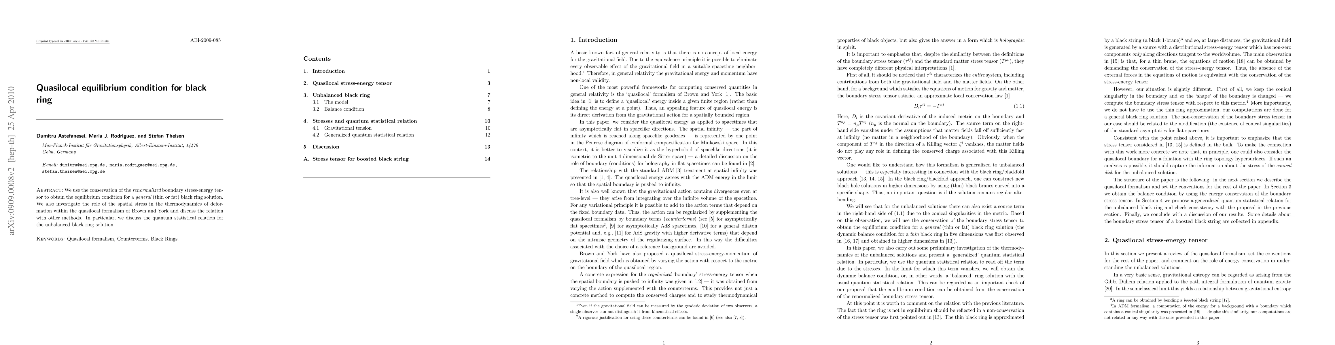 We use the conservation of the renormalized boundary stress-energy tensor to obtain the equilibrium condition for a general (thin or fat) black ring solution. We also investigate the role of the spatial stress in the thermodynamics of deformation within the quasilocal formalism of Brown and York and discuss the relation with other methods. In particular, we discuss the quantum statistical relation for the unbalanced black ring solution.