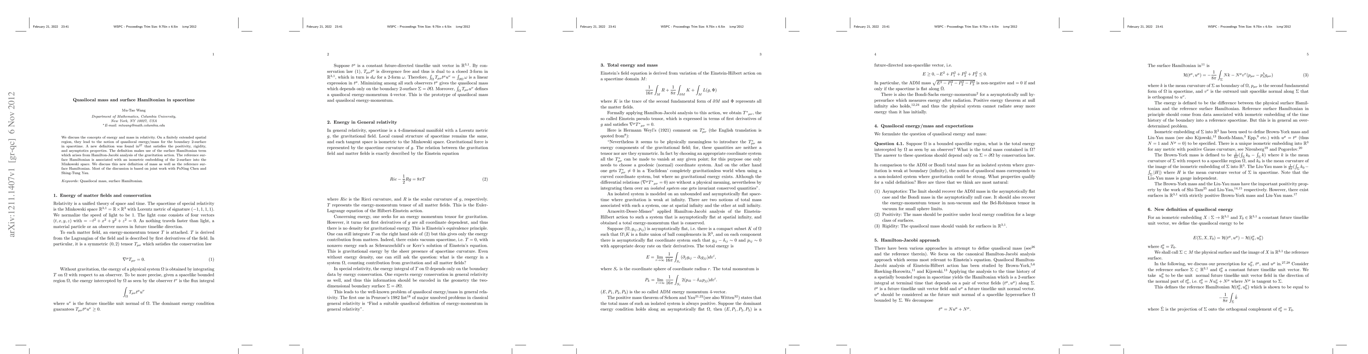 We discuss the concepts of energy and mass in relativity. On a finitely extended spatial region, they lead to the notion of quasilocal energy/mass for the boundary 2-surface in spacetime. A new definition was found in [27] that satisfies the positivity, rigidity, and asymptotics properties. The definition makes use of the surface Hamiltonian term which arises from Hamilton-Jacobi analysis of the gravitation action. The reference surface Hamiltonian is associated with an isometric embedding of the 2-surface into the Minkowski space. We discuss this new definition of mass as well as the reference sur- face Hamiltonian. Most of the discussion is based on joint work with PoNing Chen and Shing-Tung Yau.