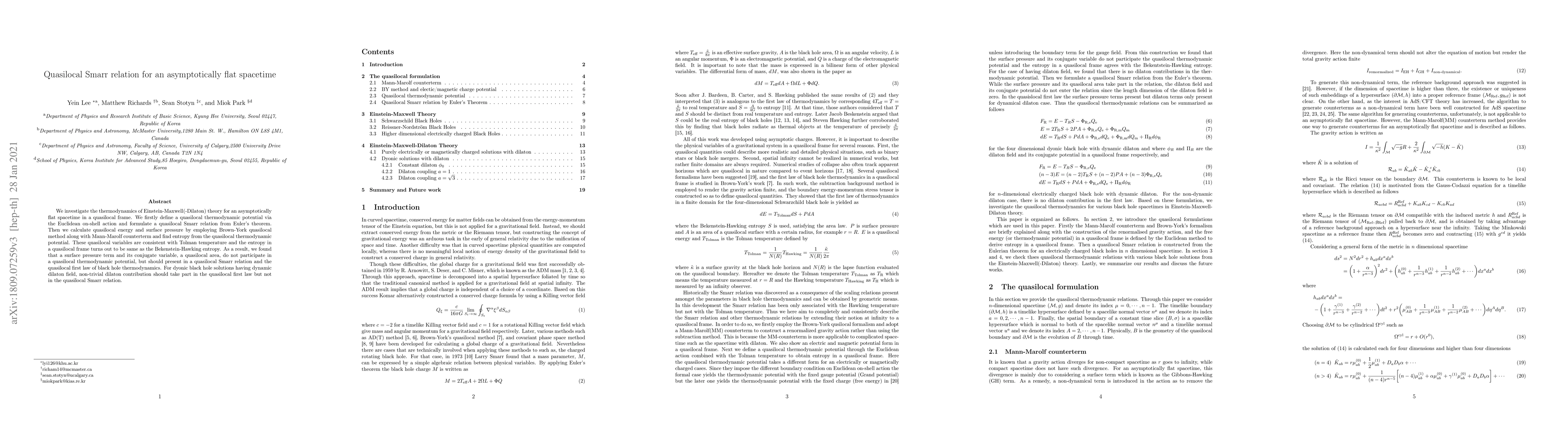 This paper formulates a quasilocal Smarr relation for asymptotically flat spacetimes in Einstein-Maxwell(-Dilaton) theory, defining quasilocal thermodynamic potentials and calculating quasilocal energy and entropy. It finds that surface pressure and quasilocal area appear in the Smarr relation but not in the thermodynamic potential, with dilaton fields affecting the first law but not the Smarr relation.