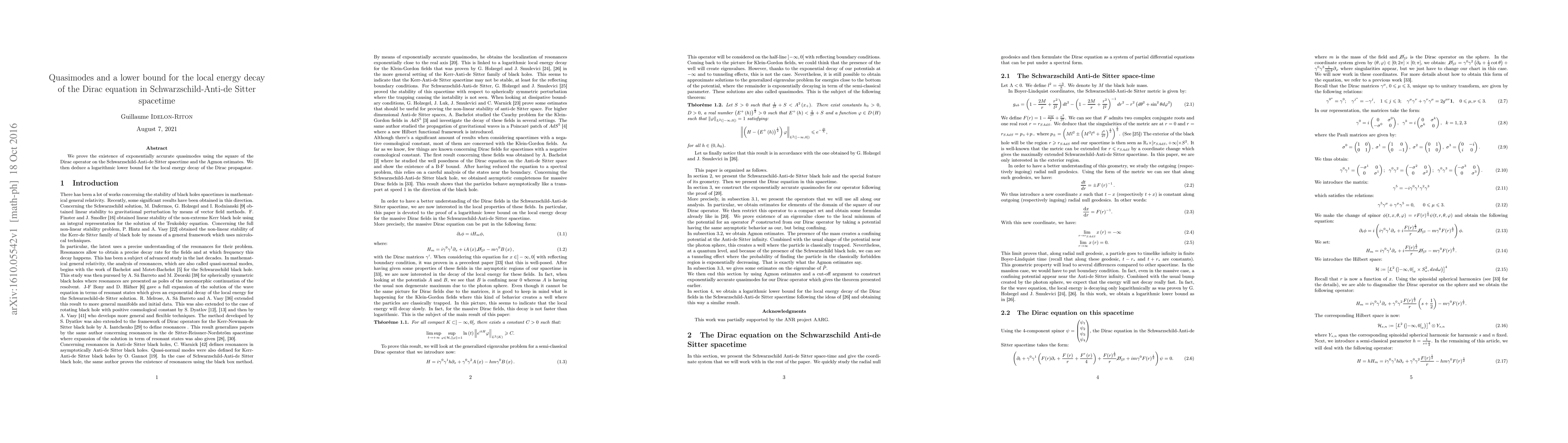 Summary: The paper establishes the existence of quasimodes for the Dirac equation in Schwarzschild-Anti-de Sitter spacetime using the Dirac operator's square and Agmon estimates, and derives a logarithmic lower bound for the local energy decay of the Dirac propagator.