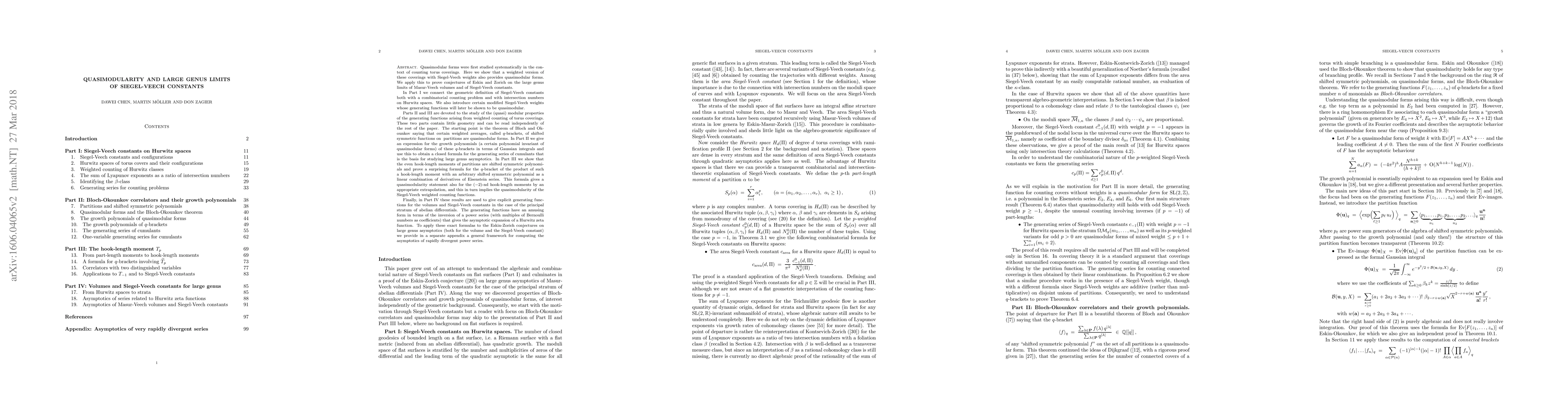 Quasimodular forms were first studied in the context of counting torus coverings. Here we show that a weighted version of these coverings with Siegel-Veech weights also provides quasimodular forms. We apply this to prove conjectures of Eskin and Zorich on the large genus limits of Masur-Veech volumes and of Siegel-Veech constants. In Part I we connect the geometric definition of Siegel-Veech constants both with a combinatorial counting problem and with intersection numbers on Hurwitz spaces. We introduce modified Siegel-Veech weights whose generating functions will later be shown to be quasimodular. Parts II and III are devoted to the study of the quasimodularity of the generating functions arising from weighted counting of torus coverings. The starting point is the theorem of Bloch and Okounkov saying that q-brackets of shifted symmetric functions are quasimodular forms. In Part II we give an expression for their growth polynomials in terms of Gaussian integrals and use this to obtain a closed formula for the generating series of cumulants that is the basis for studying large genus asymptotics. In Part III we show that the even hook-length moments of partitions are shifted symmetric polynomials and prove a formula for the q-bracket of the product of such a hook-length moment with an arbitrary shifted symmetric polynomial. This formula proves quasimodularity also for the (-2)-nd hook-length moments by extrapolation, and implies the quasimodularity of the Siegel-Veech weighted counting functions. Finally, in Part IV these results are used to give explicit generating functions for the volumes and Siegel-Veech constants in the case of the principal stratum of abelian differentials. To apply these exact formulas to the Eskin-Zorich conjectures we provide a general framework for computing the asymptotics of rapidly divergent power series.