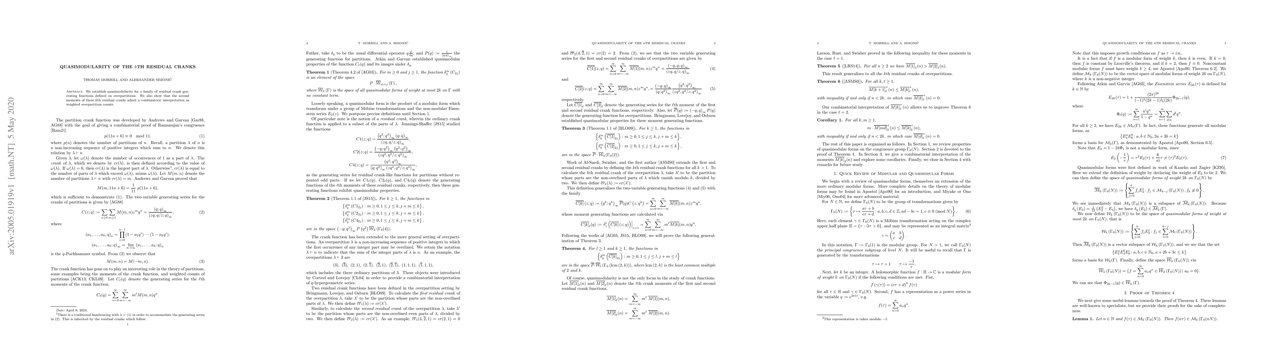 This paper establishes quasimodularity for a family of residual crank generating functions based on overpartitions and demonstrates that the second moments of these cranks correspond to weighted overpartition counts.