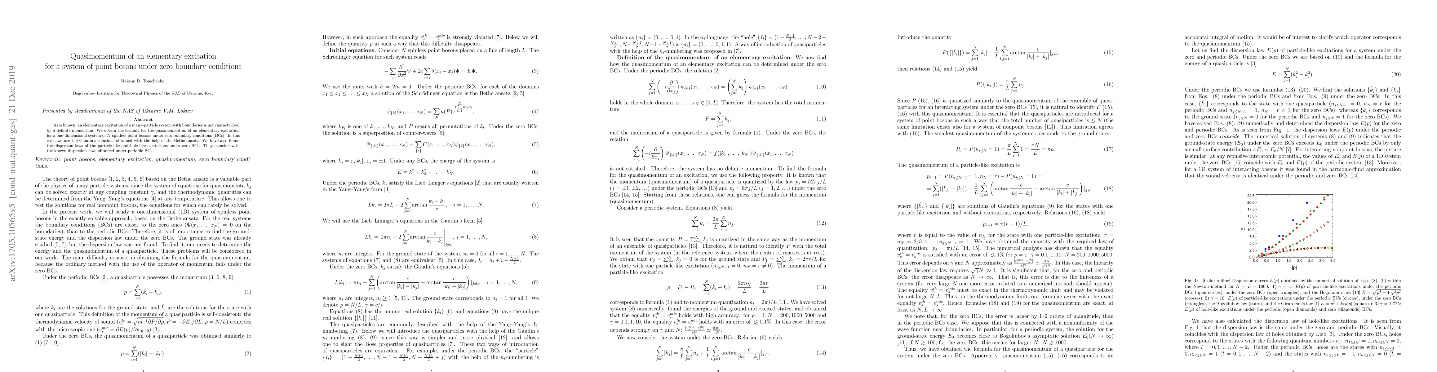 As is known, an elementary excitation of a many-particle system with boundaries is not characterized by a definite momentum. We obtain the formula for the quasimomentum of an elementary excitation for a one-dimensional system of $N$ spinless point bosons under zero boundary conditions (BCs). In this case, we use the Gaudin's solutions obtained with the help of the Bethe ansatz. We have also found the dispersion laws of the particle-like and hole-like excitations under zero BCs. They coincide with the known dispersion laws obtained for periodic BCs.