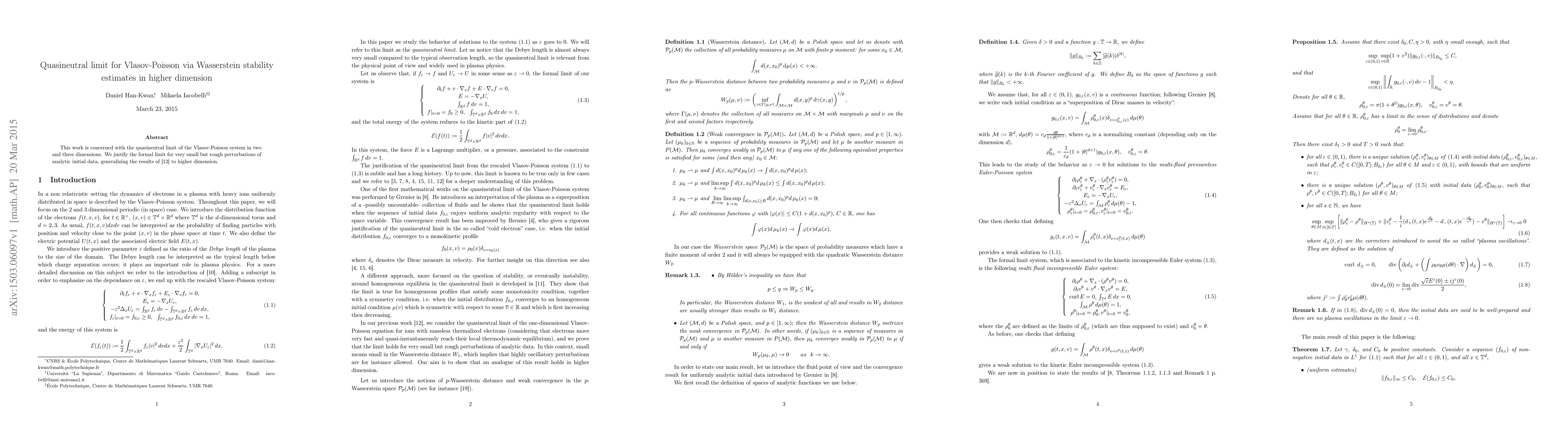Summary: This paper justifies the quasineutral limit of the Vlasov-Poisson system in two and three dimensions for small perturbations of analytic initial data, extending previous results to higher dimensions using Wasserstein stability estimates.