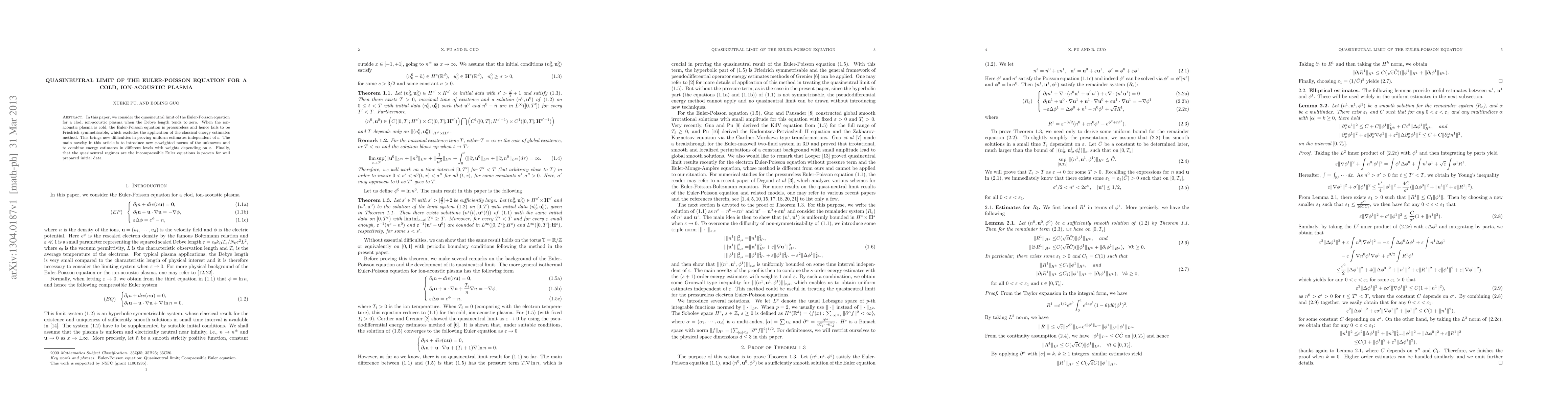 This paper investigates the quasineutral limit of the Euler-Poisson equation for a cold ion-acoustic plasma as the Debye length approaches zero. It introduces new $\varepsilon$-weighted norms and combines energy estimates to prove uniform estimates, ultimately showing that the quasineutral regime converges to the incompressible Euler equations for well-prepared initial data.