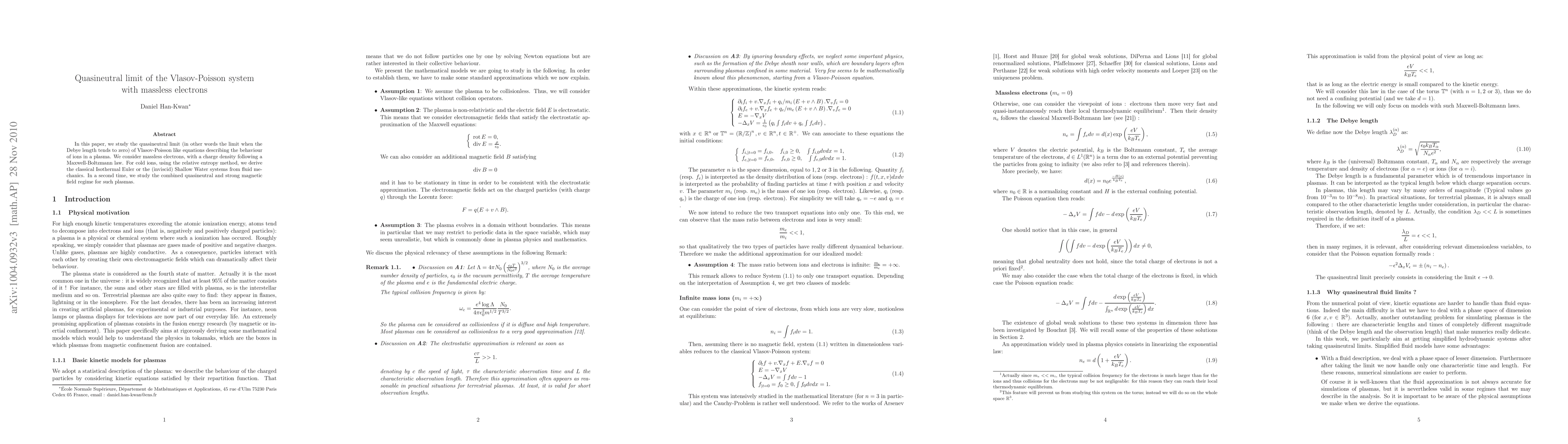 In this paper, we study the quasineutral limit (in other words the limit when the Debye length tends to zero) of Vlasov-Poisson like equations describing the behaviour of ions in a plasma. We consider massless electrons, with a charge density following a Maxwell-Boltzmann law. For cold ions, using the relative entropy method, we derive the classical Isothermal Euler or the (inviscid) Shallow Water systems from fluid mechanics. In a second time, we study the combined quasineutral and strong magnetic field regime for such plasmas.