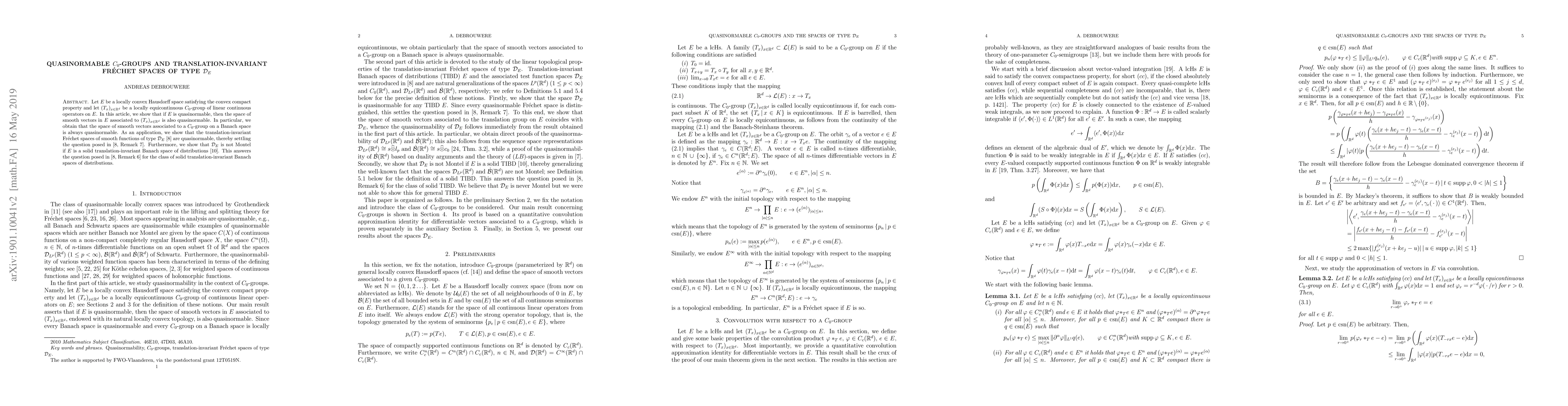 Let $E$ be a locally convex Hausdorff space satisfying the convex compact property and let $(T_x)_{x \in \mathbb{R}^d}$ be a locally equicontinuous $C_0$-group of linear continuous operators on $E$. In this article, we show that if $E$ is quasinormable, then the space of smooth vectors in $E$ associated to $(T_x)_{x \in \mathbb{R}^d}$ is also quasinormable. In particular, we obtain that the space of smooth vectors associated to a $C_0$-group on a Banach space is always quasinormable. As an application, we show that the translation-invariant Fr\'echet spaces of smooth functions of type $\mathcal{D}_E$ [8] are quasinormable, thereby settling the question posed in [8, Remark 7]. Furthermore, we show that $\mathcal{D}_E$ is not Montel if $E$ is a solid translation-invariant Banach space of distributions [10]. This answers the question posed in [8, Remark 6] for the class of solid translation-invariant Banach spaces of distributions.