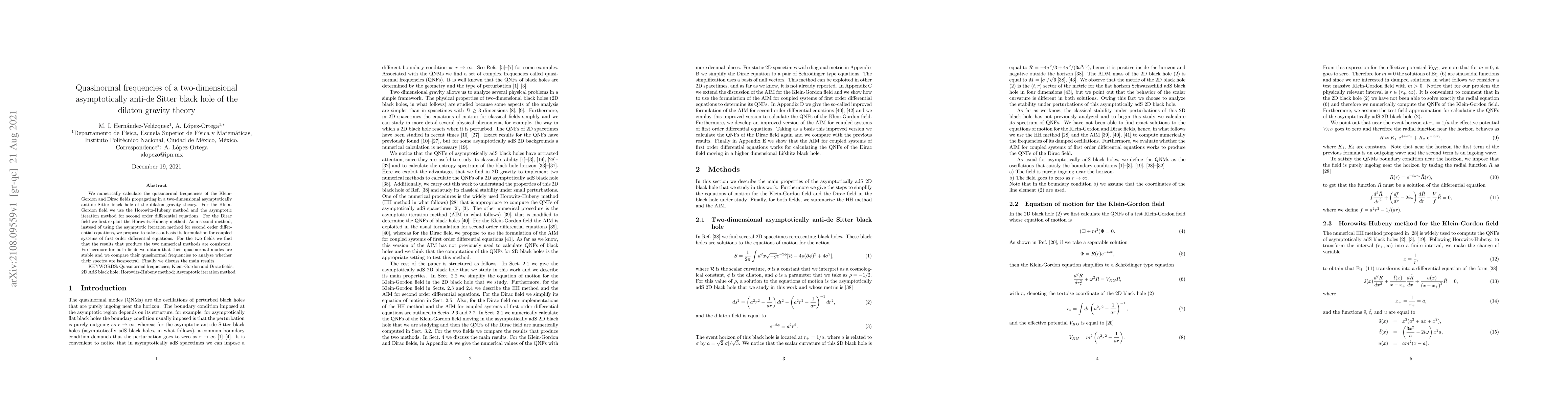 We numerically calculate the quasinormal frequencies of the Klein-Gordon and Dirac fields propagating in a two-dimensional asymptotically anti-de Sitter black hole of the dilaton gravity theory. For the Klein-Gordon field we use the Horowitz-Hubeny method and the asymptotic iteration method for second order differential equations. For the Dirac field we first exploit the Horowitz-Hubeny method. As a second method, instead of using the asymptotic iteration method for second order differential equations, we propose to take as a basis its formulation for coupled systems of first order differential equations. For the two fields we find that the results that produce the two numerical methods are consistent. Furthermore for both fields we obtain that their quasinormal modes are stable and we compare their quasinormal frequencies to analyze whether their spectra are isospectral. Finally we discuss the main results.