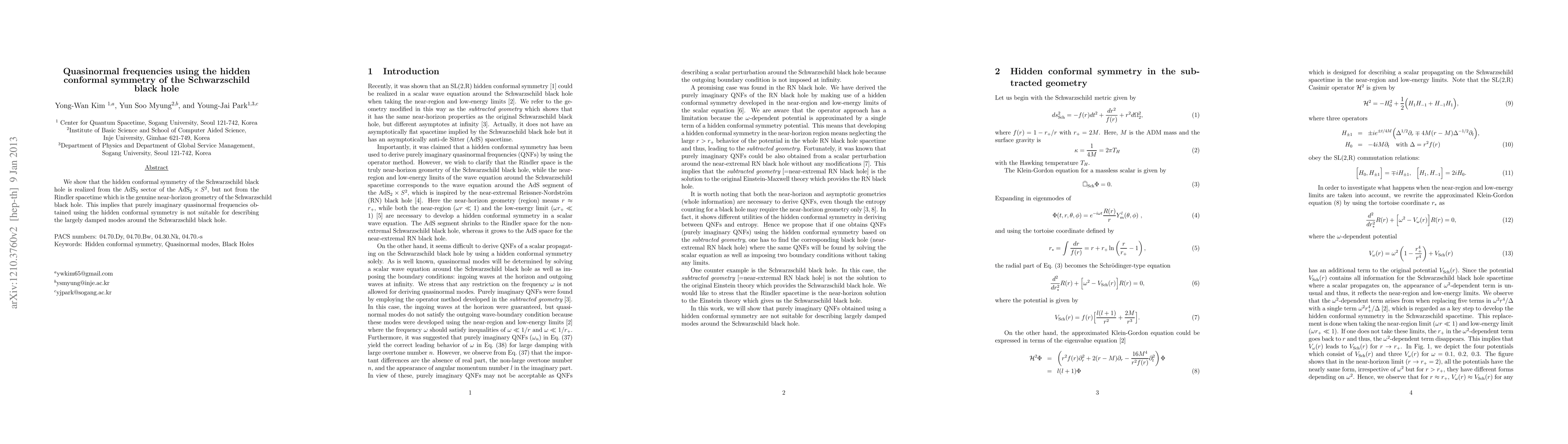 Summary: The paper demonstrates that the hidden conformal symmetry of the Schwarzschild black hole is realized in the AdS$_2$ sector but not in Rindler spacetime, indicating that the purely imaginary quasinormal frequencies derived from this symmetry are unsuitable for describing the damped modes near the Schwarzschild black hole.