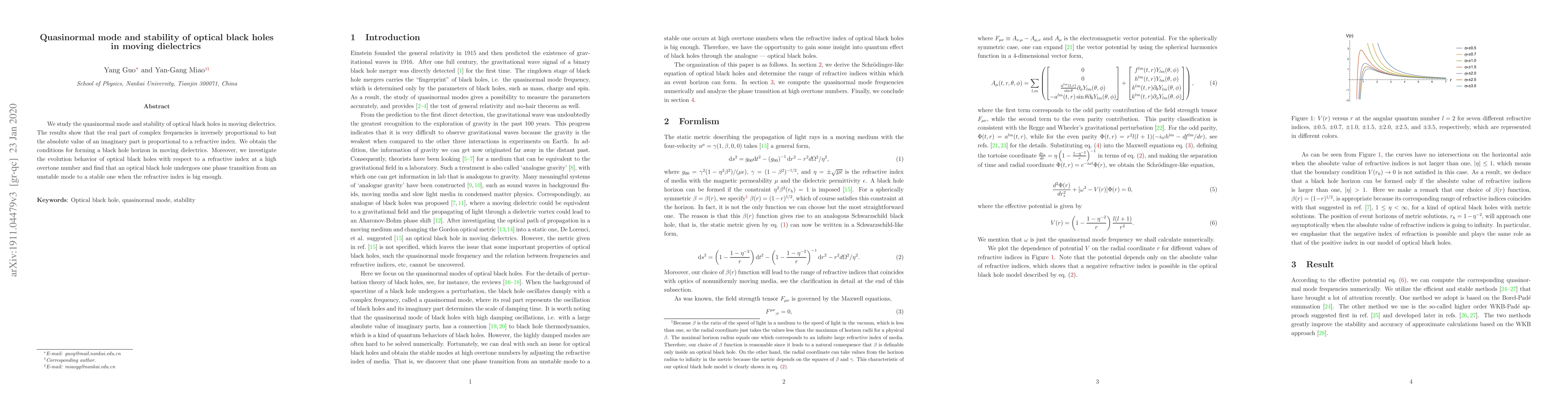 The research examines optical black holes in moving dielectrics, discovering that their quasinormal mode frequencies' real parts inversely relate to the refractive index, while imaginary parts' magnitudes directly relate. The study also reveals conditions for horizon formation and observes an unstable-to-stable phase transition in optical black holes as the refractive index increases significantly.
