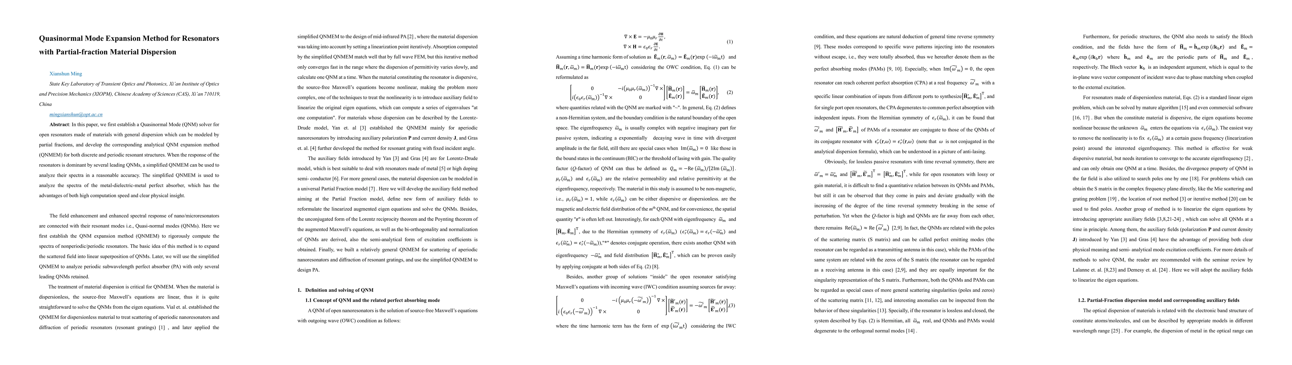 This paper introduces a Quasinormal Mode (QNM) solver for open resonators with material dispersion modeled by partial fractions, and develops an analytical QNM expansion method (QNMEM) for both discrete and periodic structures. The simplified QNMEM is applied to analyze the spectra of metal-dielectric-metal perfect absorbers, offering high computational speed and clear physical insight.