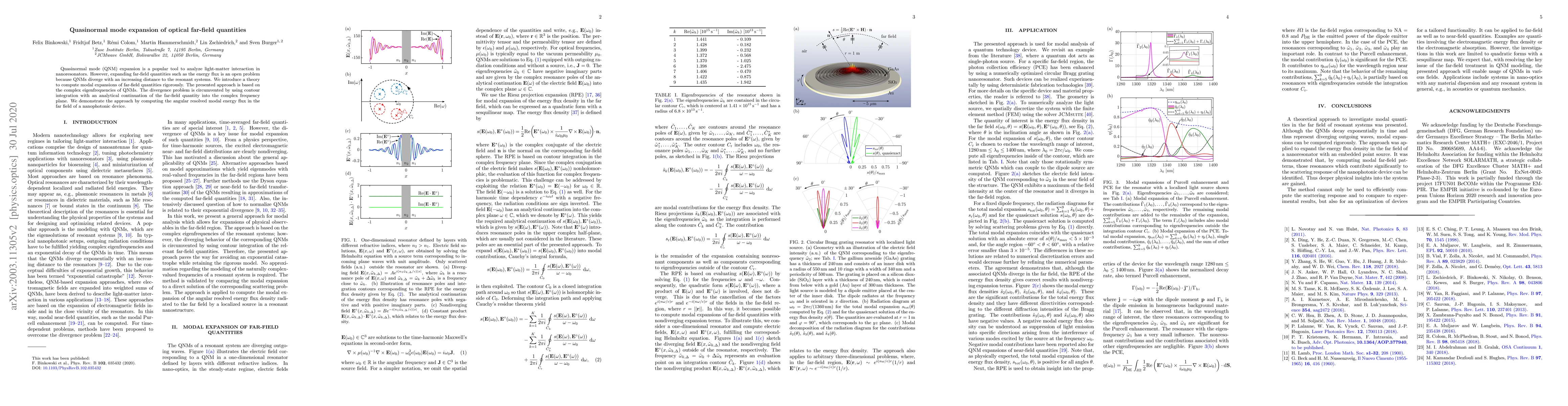 Quasinormal mode (QNM) expansion is a popular tool to analyze light-matter interaction in nanoresonators. However, expanding far-field quantities such as the energy flux is an open problem because QNMs diverge with an increasing distance to the resonant systems. We introduce a theory to compute modal expansions of far-field quantities rigorously. The presented approach is based on the complex eigenfrequencies of QNMs. The divergence problem is circumvented by using contour integration with an analytical continuation of the far-field quantity into the complex frequency plane. We demonstrate the approach by computing the angular resolved modal energy flux in the far field of a nanophotonic device.
