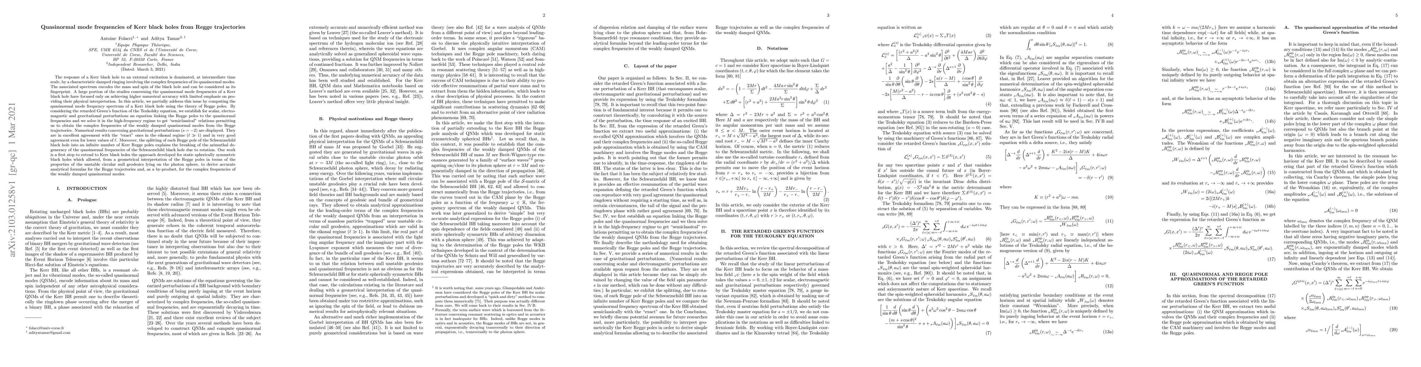 A large portion of the studies concerning the quasinormal mode frequencies of a Kerr black hole have focused only on achieving higher numerical accuracy with limited emphasis on providing their physical interpretation. In this article, we partially address this issue by computing the quasinormal mode frequency spectrum of a Kerr black hole using the theory of Regge poles. By considering the retarded Green's function of the Teukolsky equation, we establish for scalar, electromagnetic and gravitational perturbations an equation linking the Regge poles to the quasinormal frequencies and we solve it in the high-frequency regime to get "semiclassical" relations permitting us to obtain the complex frequencies of the weakly damped quasinormal modes from the Regge trajectories. Numerical results concerning gravitational perturbations ($s=-2$) are displayed. They are in excellent agreement with the "exact" ones in the eikonal regime $(\ell \gg 1)$ and in very good agreement even for lower values of $\ell$. Moreover, the splitting of each Regge pole of the Schwarzschild black hole into an infinite number of Kerr Regge poles explains the breaking of the azimuthal degeneracy of the quasinormal frequencies of the Schwarzschild black hole due to rotation. Our work is a first step to extend to Kerr black holes the approach developed for static spherically symmetric black holes which allowed, from a geometrical interpretation of the Regge poles in terms of the properties of the unstable circular null geodesics lying on the photon sphere, to derive accurate analytical formulas for the Regge trajectories and, as a by-product, for the complex frequencies of the weakly damped quasinormal modes.