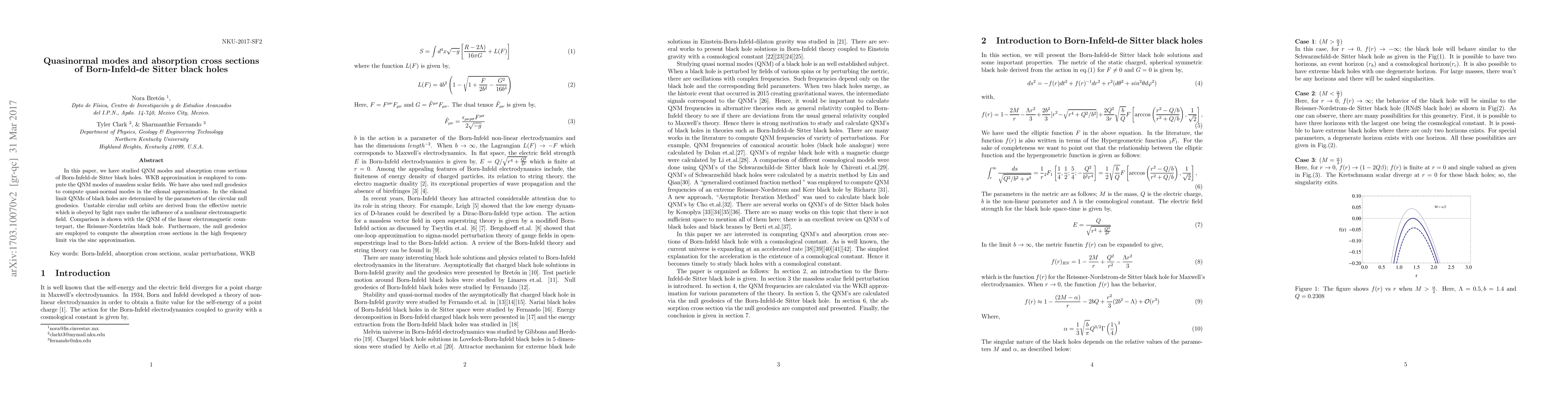 The paper presents a comprehensive analysis of QNMs and absorption cross sections for BIdS black holes using WKB approximation and null geodesics, providing a detailed comparison with RNdS black holes.