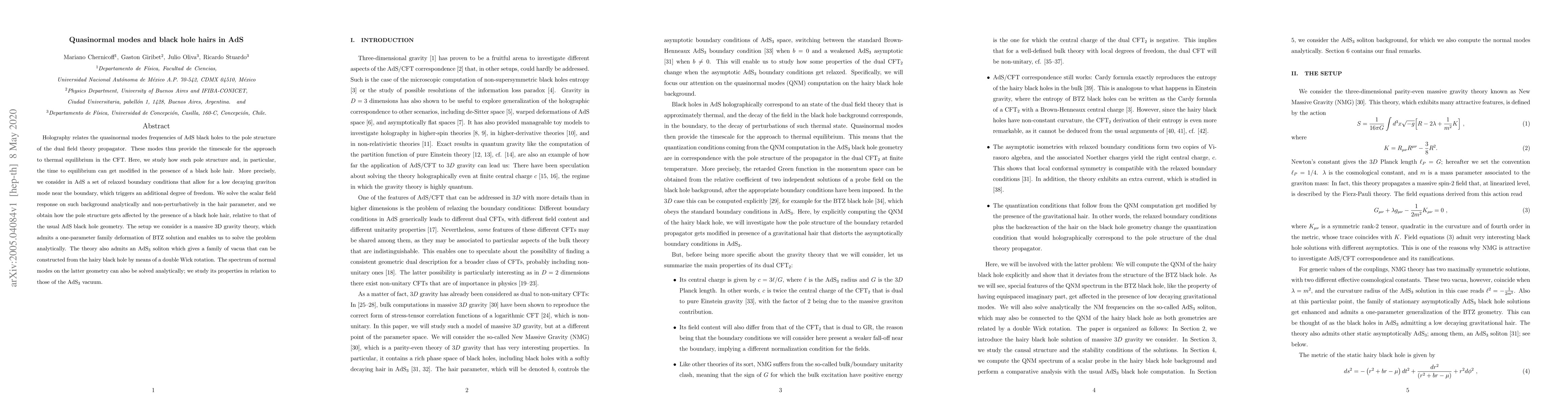 Holography relates the quasinormal modes frequencies of AdS black holes to the pole structure of the dual field theory propagator. These modes thus provide the timescale for the approach to thermal equilibrium in the CFT. Here, we study how such pole structure and, in particular, the time to equilibrium can get modified in the presence of a black hole hair. More precisely, we consider in AdS a set of relaxed boundary conditions that allow for a low decaying graviton mode near the boundary, which triggers an additional degree of freedom. We solve the scalar field response on such background analytically and non-perturbatively in the hair parameter, and we obtain how the pole structure gets affected by the presence of a black hole hair, relative to that of the usual AdS black hole geometry. The setup we consider is a massive 3D gravity theory, which admits a one-parameter family deformation of BTZ solution and enables us to solve the problem analytically. The theory also admits an AdS$_3$ soliton which gives a family of vacua that can be constructed from the hairy black hole by means of a double Wick rotation. The spectrum of normal modes on the latter geometry can also be solved analytically; we study its properties in relation to those of the AdS$_3$ vacuum.