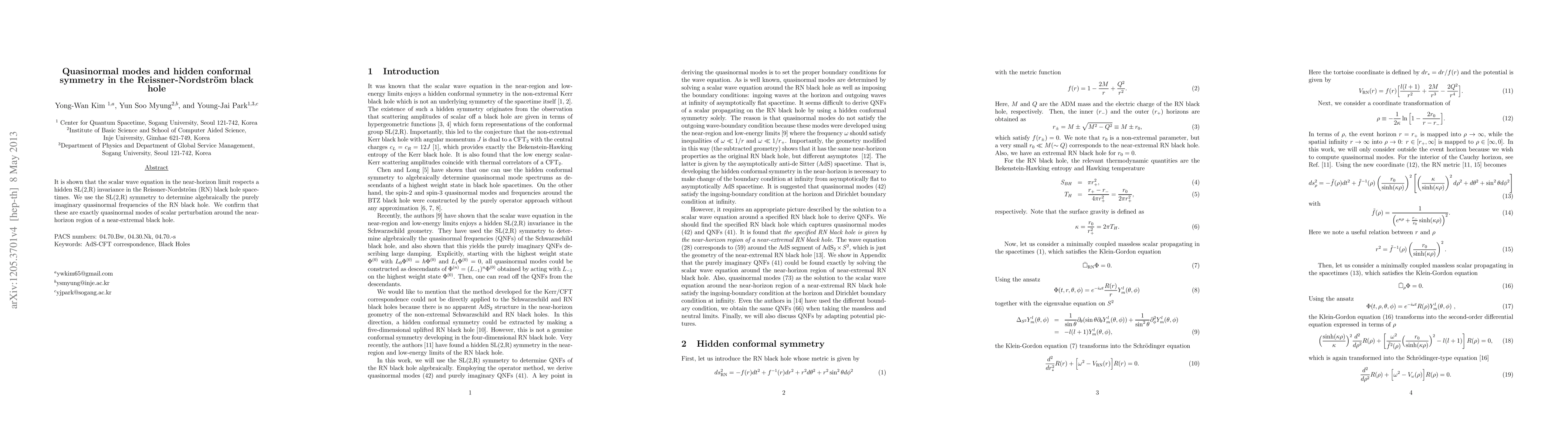 It is shown that the scalar wave equation in the near-horizon limit respects a hidden SL(2,R) invariance in the Reissner-Nordstrom (RN) black hole spacetimes. We use the SL(2,R) symmetry to determine algebraically the purely imaginary quasinormal frequencies of the RN black hole. We confirm that these are exactly quasinormal modes of scalar perturbation around the near-extremal black hole.
